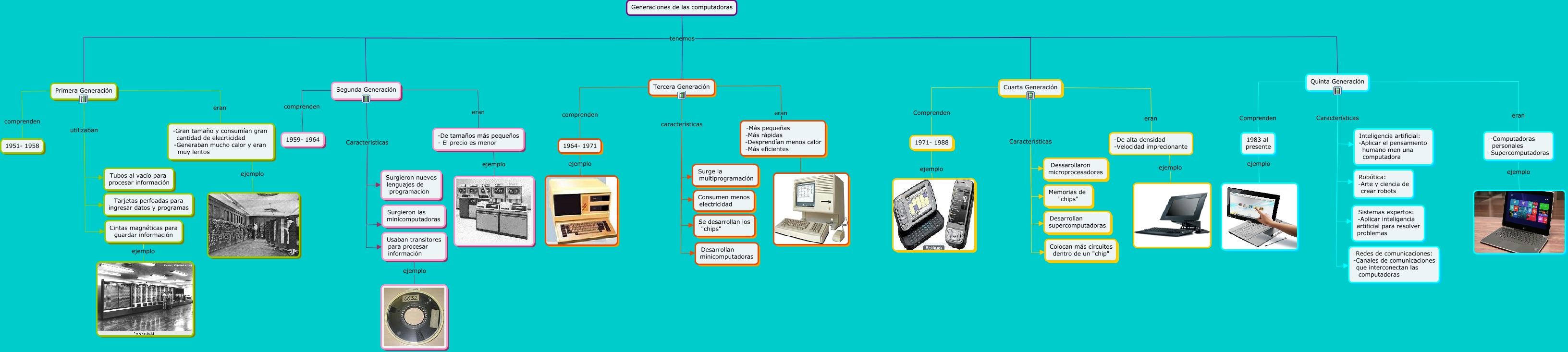 Este Cmap, tiene información relacionada con: Generaciones, Generaciones de las computadoras tenemos Primera Generación, Generaciones de las computadoras tenemos Segunda Generación, -De alta densidad -Velocidad imprecionante ejemplo, Tercera Generación características Desarrollan minicomputadoras, Generaciones de las computadoras tenemos Quinta Generación, Tercera Generación características Surge la multiprogramación, 1971- 1988 ejemplo, -De tamaños más pequeños - El precio es menor ejemplo, Generaciones de las computadoras tenemos Cuarta Generación, Segunda Generación Características Surgieron nuevos lenguajes de programación, Segunda Generación Características Surgieron las minicomputadoras, Quinta Generación Características Robótica: -Arte y ciencia de crear robots, Cintas magnéticas para guardar información ejemplo, -Computadoras personales -Supercomputadoras ejemplo, Segunda Generación eran -De tamaños más pequeños - El precio es menor, Quinta Generación eran -Computadoras personales -Supercomputadoras, Quinta Generación Comprenden 1983 al presente, Primera Generación utilizaban Tarjetas perfoadas para ingresar datos y programas, Segunda Generación comprenden 1959- 1964, -Gran tamaño y consumían gran cantidad de elecrticidad -Generaban mucho calor y eran muy lentos ejemplo