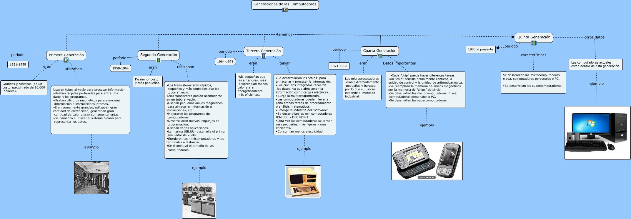 Este Cmap, tiene información relacionada con: Generaciones de las Computadoras, Segunda Generación tenemos Quinta Generación, Primera Generación período 1951-1958, Tercera Generación tenemos Quinta Generación, Cuarta Generación Datos importantes •Cada "chip" puede hacer diferentes tareas. •Un "chip" sencillo actualmente contiene la unidad de control y la unidad de aritmética/lógica. •Se reemplaza la memoria de anillos magnéticos por la memoria de "chips" de silicio. •Se desarrollan las microcomputadoras, o sea, computadoras personales o PC. •Se desarrollan las supercomputadoras., Quinta Generación características Se desarrollan las microcomputadoras, o sea, computadoras personales o PC. •Se desarrollan las supercomputadoras., Segunda Generación utilizaban •Los transistores eran rápidos, pequeños y más confiables que los tubos al vacío. •200 transistores podían acomodarse en un tubo al vacío. •Usaban pequeños anillos magnéticos para almacenar información e instrucciones, etc. •Mejoraron los programas de computadoras. •Desarrollaron nuevos lenguajes de programación. •Usaban varias aplicaciones. •La marina (EE.UU) desarrolla el primer simulador de vuelo. •Surgieron las minicomputadoras y los terminales a distancia. •Se disminuyó el tamaño de las computadoras., Generaciones de las Computadoras tenemos Cuarta Generación, Segunda Generación período 1958-1964, Primera Generación eran Grandes y costosas (de un costo aproximado de 10,000 dólares)., Segunda Generación eran De menor costo y más pequeñas., Segunda Generación tenemos Cuarta Generación, Tercera Generación tenemos Cuarta Generación, Tercera Generación eran Más pequeñas que las anteriores, más desprendían menos calor y eran energéticamente más eficientes., •Los transistores eran rápidos, pequeños y más confiables que los tubos al vacío. •200 transistores podían acomodarse en un tubo al vacío. •Usaban pequeños anillos magnéticos para almacenar información e instrucciones, etc. •Mejoraron los programas de computadoras. •Desarrollaron nuevos lenguajes de programación. •Usaban varias aplicaciones. •La marina (EE.UU) desarrolla el primer simulador de vuelo. •Surgieron las minicomputadoras y los terminales a distancia. •Se disminuyó el tamaño de las computadoras. ejemplo ????, •Se desarrollaron los "chips" para almacenar y procesar la información. •Los circuitos integrados recuerda, los datos, ya que almacenan la información como cargas eléctricas. •Surge la multiprogramación. •Las computadoras pueden llevar a cabo ambas tareas de procesamiento o análisis matemáticos. •Emerge la industria del "software". •Se desarrollan las minicomputadoras IBM 360 y DEC PDP-1. •Otra vez las computadoras se tornan más pequeñas, más ligeras y más eficientes. •Consumían menos electricidad ejemplo, Usaban tubos al vacío para procesar información. •Usaban tarjetas perforadas para entrar los datos y los programas. •Usaban cilindros magnéticos para almacenar información e instrucciones internas. •Eran sumamente grandes, utilizaban gran cantidad de electricidad, generaban gran cantidad de calor y eran sumamente lentas. •Se comenzó a utilizar el sistema binario para representar los datos. ejemplo, Generaciones de las Computadoras tenemos Primera Generación, Quinta Generación otros datos Las computadoras actuales están dentro de esta generación., Quinta Generación período 1983 al presente, •Cada "chip" puede hacer diferentes tareas. •Un "chip" sencillo actualmente contiene la unidad de control y la unidad de aritmética/lógica. •Se reemplaza la memoria de anillos magnéticos por la memoria de "chips" de silicio. •Se desarrollan las microcomputadoras, o sea, computadoras personales o PC. •Se desarrollan las supercomputadoras. ejemplo ????
