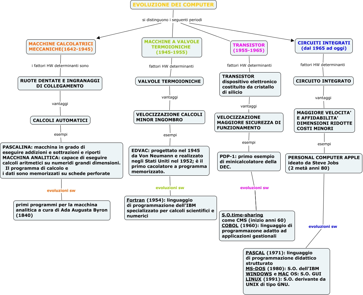 Questa Cmap, creata con IHMC CmapTools, contiene informazioni relative a: evoluzioni dei computer, VELOCIZZAZIONE MAGGIORE SICUREZZA DI FUNZIONAMENTO esempi PDP-1: primo esempio di minicalcolatore della DEC., EVOLUZIONE DEI COMPUTER si distinguono i seguenti periodi MACCHINE A VALVOLE TERMOIONICHE (1945-1955), EDVAC: progettato nel 1945 da Von Neumann e realizzato negli Stati Uniti nel 1952; è il primo cacolatore a programma memorizzato. evoluzioni sw Fortran (1954): linguaggio di programmazione dell'IBM specializzato per calcoli scientifici e numerici, VELOCIZZAZIONE CALCOLI MINOR INGOMBRO esempi EDVAC: progettato nel 1945 da Von Neumann e realizzato negli Stati Uniti nel 1952; è il primo cacolatore a programma memorizzato., PASCALINA: macchina in grado di eseguire addizioni e sottrazioni e riporti MACCHINA ANALITICA: capace di eseguire calcoli aritmetici su numeridi grandi dimensioni. Il programma di calcolo e i dati sono memorizzati su schede perforate evoluzioni sw primi programmi per la macchina analitica a cura di Ada Augusta Byron (1840), RUOTE DENTATE E INGRANAGGI DI COLLEGAMENTO vantaggi CALCOLI AUTOMATICI, VALVOLE TERMOIONICHE vantaggi VELOCIZZAZIONE CALCOLI MINOR INGOMBRO, MACCHINE CALCOLATRICI MECCANICHE(1642-1945) i fattori HW determinanti sono RUOTE DENTATE E INGRANAGGI DI COLLEGAMENTO, CIRCUITI INTEGRATI (dal 1965 ad oggi) fattori HW determinanti CIRCUITO INTEGRATO, PDP-1: primo esempio di minicalcolatore della DEC. evoluzioni sw S.O.time-sharing come CMS (inizio anni 60) COBOL (1960): linguaggio di programmazone adatto ad applicazioni gestionali, EVOLUZIONE DEI COMPUTER si distinguono i seguenti periodi TRANSISTOR (1955-1965), MACCHINE A VALVOLE TERMOIONICHE (1945-1955) fattori HW determinanti VALVOLE TERMOIONICHE, CALCOLI AUTOMATICI esempi PASCALINA: macchina in grado di eseguire addizioni e sottrazioni e riporti MACCHINA ANALITICA: capace di eseguire calcoli aritmetici su numeridi grandi dimensioni. Il programma di calcolo e i dati sono memorizzati su schede perforate, MAGGIORE VELOCITA' E AFFIDABILITA' DIMENSIONI RIDOTTE COSTI MINORI esempi PERSONAL COMPUTER APPLE ideato da Steve Jobs (2 metà anni 80), TRANSISTOR (1955-1965) fattori HW determinanti TRANSISTOR dispositivo elettronico costituito da cristallo di silicio, EVOLUZIONE DEI COMPUTER si distinguono i seguenti periodi MACCHINE CALCOLATRICI MECCANICHE(1642-1945), TRANSISTOR dispositivo elettronico costituito da cristallo di silicio vantaggi VELOCIZZAZIONE MAGGIORE SICUREZZA DI FUNZIONAMENTO, CIRCUITO INTEGRATO vantaggi MAGGIORE VELOCITA' E AFFIDABILITA' DIMENSIONI RIDOTTE COSTI MINORI, EVOLUZIONE DEI COMPUTER si distinguono i seguenti periodi CIRCUITI INTEGRATI (dal 1965 ad oggi), PERSONAL COMPUTER APPLE ideato da Steve Jobs (2 metà anni 80) evoluzioni sw PASCAL (1971): linguaggio di programmazione didattico strutturato MS-DOS (1980): S.O. dell'IBM WINDOWS e MAC OS: S.O. GUI LINUX (1991): S.O. derivante da UNIX di tipo GNU.