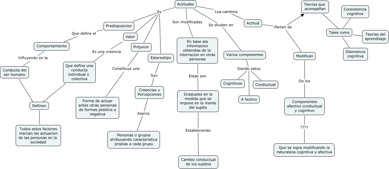 Este Cmap, tiene información relacionada con: Actitudes, Actitudes Es Estereotipo, Graduales en la medida que se impone en la mente del sujeto Estableciendo Cambio conductual de los sujetos, Prejuicio Constituye una Forma de actuar antes otras personas de formas positiva o negativa, Varios componentes Siendo estos Conductual, Varios componentes Siendo estos A fectivo, Actitudes Es Predisposicion, Tales como ???? Disonancia cognitiva, Actitudes Se dividen en Varios componentes, Comportamiento Influyendo en la Conducta del ser humano, Teorias que acompañan ???? Tales como, Actitud Parten de Teorias que acompañan, Varios componentes Siendo estos Cognitivos, Actitud Parten de Modifican, Actitudes Es Valor, Actitudes Es Prejuicio, Predisposicion Que define el Comportamiento, Componentes afectivo conductual y cognitivo ???? Que se logra modificando la naturaleza cognitiva y afectiva, Valor Es una creencia Que define una conducta individual o colectiva, Definen ???? Todos estos factores marcan las actuacion de las personas en la sociedad, Estereotipo Son Creencias y Percepciones