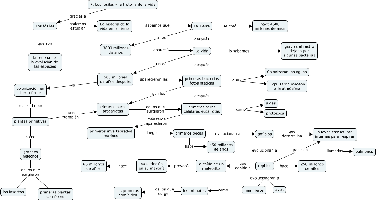 Este Cmap, tiene información relacionada con: 7. Los fósiles y la historia de la vida, grandes helechos de los que surgieron primeras plantas con flores, anfibios evolucionan a reptiles, La historia de la vida en la Tierra sabemos que La Tierra, La Tierra se creó hace 4500 millones de años, 7. Los fósiles y la historia de la vida gracias a Los fósiles, primeras bacterias fotosintéticas que Expulsaron oxígeno a la atmósfera, reptiles que debido a la caída de un meteorito, reptiles evolucionaron a aves, La vida unos 600 millones de años después, primeros peces evolucionan a anfibios, primeros seres celulares eucariotas como algas, Los fósiles que son la prueba de la evolución de las especies, plantas primitivas son también primeros seres procariotas, anfibios que desarrollan nuevas estructuras internas para respirar, La Tierra a los 3800 millones de años, La Tierra después La vida, colonización en tierra firme realizada por plantas primitivas, grandes helechos de los que surgieron los insectos, primeros seres celulares eucariotas como protozoos, 3800 millones de años apareció La vida