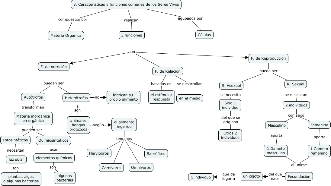 Este Cmap, tiene información relacionada con: 3. Características y funciones comunes de los Seres Vivos, R. Asexual se necesita Solo 1 individuo, el alimento ingerido tenemos Saprófitos, el alimento ingerido tenemos Carnívoros, 3. Características y funciones comunes de los Seres Vivos realizan 3 funciones, 2 individuos con sexo Femenino, 1 Gameto masculino al unirse Fecundación, F. de Relación basados en el estímulo/ respuesta, 3. Características y funciones comunes de los Seres Vivos compuestos por Materia Orgánica, Masculino aporta 1 Gameto masculino, 3 funciones son F. de Relación, el alimento ingerido tenemos Hervíboros, 3. Características y funciones comunes de los Seres Vivos agupados por Células, 2 individuos con sexo Masculino, Materia inorgánica en orgánica pueden ser Quimiosintéticos, Heterótrofos son animales hongos protozoos, un cigoto que da lugar a 1 individuo, F. de Relación se desarrollan en el medio, R. Sexual se necesitan 2 individuos, Autótrofos transforman Materia inorgánica en orgánica, Heterótrofos no fabrican su propio alimento