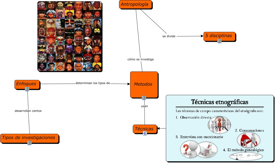 Este Cmap, tiene información relacionada con: Antropología, Metodos usan Técnicas, Enfoques desarrollan ciertos Tipos de investigaciones, Antropología se divide 5 disciplinas, ???? ???? Técnicas, Antropología cómo se investiga Metodos, Enfoques determinan los tipos de Metodos