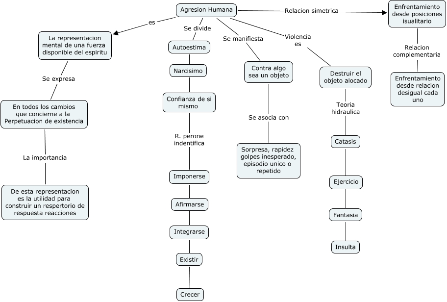 Este Cmap, tiene información relacionada con: Agresion Humana, Agresion Humana Violencia es Destruir el objeto alocado, Fantasia ???? Insulta, Existir ???? Crecer, Enfrentamiento desde posiciones isualitario Relacion complementaria Enfrentamiento desde relacion desigual cada uno, Integrarse ???? Existir, Contra algo sea un objeto Se asocia con Sorpresa, rapidez golpes inesperado, episodio unico o repetido, Agresion Humana Se manifiesta Contra algo sea un objeto, Catasis ???? Ejercicio, Confianza de si mismo R. perone indentifica Imponerse, La representacion mental de una fuerza disponible del espiritu Se expresa En todos los cambios que concierne a la Perpetuacion de existencia, Agresion Humana Se divide Autoestima, Agresion Humana Relacion simetrica Enfrentamiento desde posiciones isualitario, Destruir el objeto alocado Teoria hidraulica Catasis, Catasis ???? Ejercicio, En todos los cambios que concierne a la Perpetuacion de existencia La importancia De esta representacion es la utilidad para construir un respertorio de respuesta reacciones, Autoestima ???? Confianza de si mismo, Fantasia ???? Insulta, Autoestima ???? Narcisimo, Agresion Humana es La representacion mental de una fuerza disponible del espiritu, Imponerse ???? Afirmarse