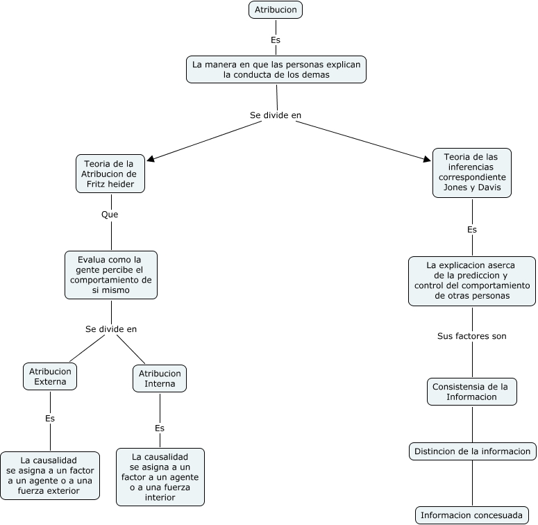 Este Cmap, tiene información relacionada con: Atribucion, La explicacion aserca de la prediccion y control del comportamiento de otras personas Sus factores son Consistensia de la Informacion, Atribucion Es La manera en que las personas explican la conducta de los demas, La manera en que las personas explican la conducta de los demas Se divide en Teoria de la Atribucion de Fritz heider, La manera en que las personas explican la conducta de los demas Se divide en Teoria de las inferencias correspondiente Jones y Davis, Atribucion Externa Es La causalidad se asigna a un factor a un agente o a una fuerza exterior, Consistensia de la Informacion ???? Informacion concesuada, Teoria de las inferencias correspondiente Jones y Davis Es La explicacion aserca de la prediccion y control del comportamiento de otras personas, Atribucion Interna Es La causalidad se asigna a un factor a un agente o a una fuerza interior, Consistensia de la Informacion ???? Distincion de la informacion, Teoria de la Atribucion de Fritz heider Que Evalua como la gente percibe el comportamiento de si mismo, Evalua como la gente percibe el comportamiento de si mismo Se divide en Atribucion Externa, Evalua como la gente percibe el comportamiento de si mismo Se divide en Atribucion Interna