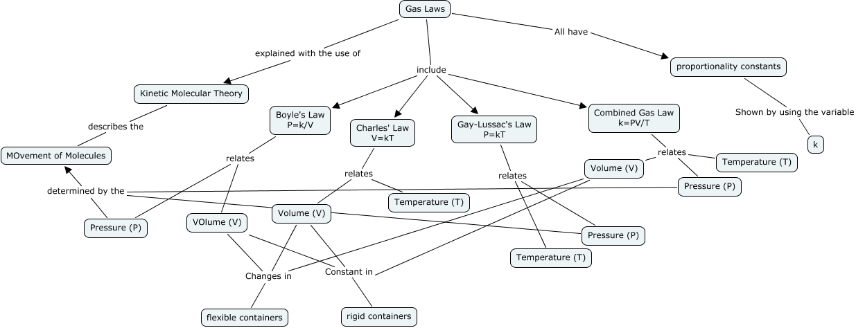 This Concept Map, created with IHMC CmapTools, has information related to: Gas Laws, Volume (V) Changes in flexible containers, Gay-Lussac's Law P=kT relates Temperature (T), Volume (V) Constant in rigid containers, Kinetic Molecular Theory describes the MOvement of Molecules, Gas Laws include Combined Gas Law k=PV/T, Gay-Lussac's Law P=kT relates Pressure (P), Charles' Law V=kT relates Volume (V), Combined Gas Law k=PV/T relates Temperature (T), Pressure (P) determined by the MOvement of Molecules, Combined Gas Law k=PV/T relates Volume (V), Boyle's Law P=k/V relates Pressure (P), Gas Laws include Gay-Lussac's Law P=kT, Combined Gas Law k=PV/T relates Pressure (P), Gas Laws include Boyle's Law P=k/V, Volume (V) Constant in rigid containers, Boyle's Law P=k/V relates VOlume (V), Gas Laws All have proportionality constants, Pressure (P) determined by the MOvement of Molecules, Gas Laws include Charles' Law V=kT, VOlume (V) Constant in rigid containers