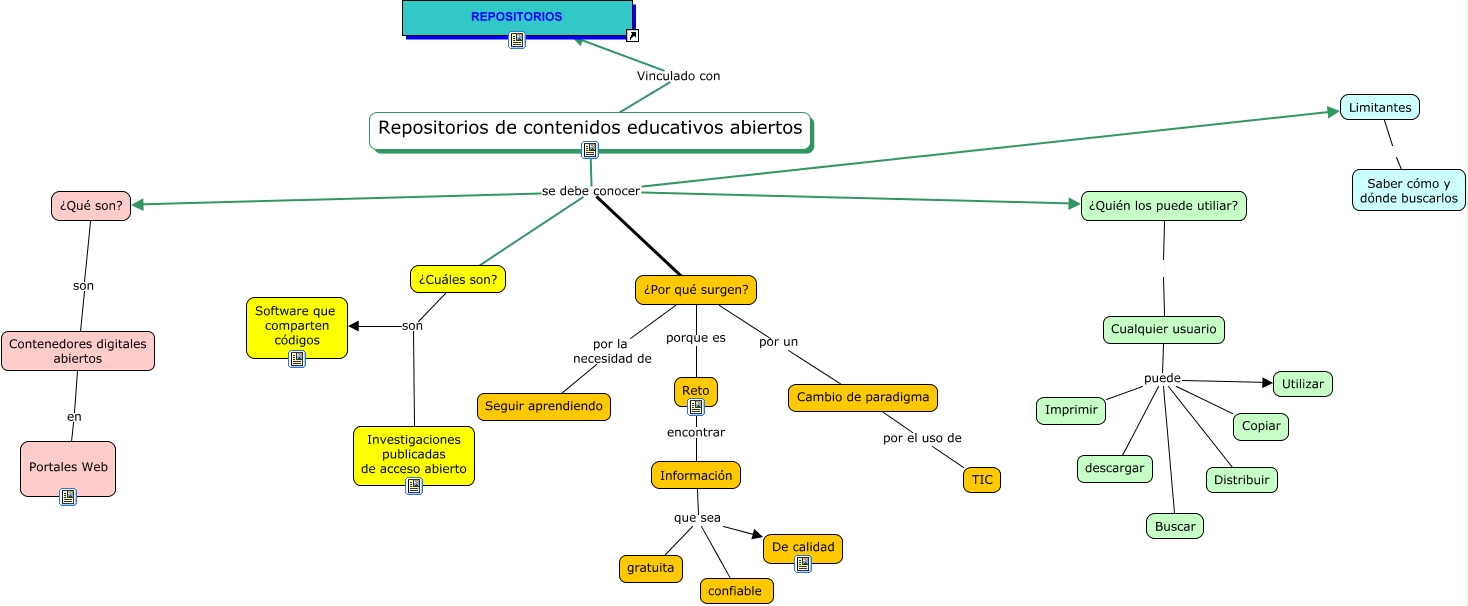 Este Cmap, tiene información relacionada con: Repositorios de contenidos educativos abiertos, Cambio de paradigma por el uso de TIC, Cualquier usuario puede Utilizar, Cualquier usuario puede Buscar, ¿Cuáles son? son Investigaciones publicadas de acceso abierto, Cualquier usuario puede Copiar, Repositorios de contenidos educativos abiertos Vinculado con REPOSITORIOS, Repositorios de contenidos educativos abiertos se debe conocer ¿Qué son?, Limitantes Saber cómo y dónde buscarlos, Contenedores digitales abiertos en Portales Web, ¿Cuáles son? son Software que comparten códigos, Cualquier usuario puede Distribuir, Cualquier usuario puede descargar, ¿Por qué surgen? por la necesidad de Seguir aprendiendo, Información que sea confiable, ¿Quién los puede utiliar? Cualquier usuario, Cualquier usuario puede Imprimir, Repositorios de contenidos educativos abiertos se debe conocer ¿Por qué surgen?, Información que sea De calidad, ¿Por qué surgen? por un Cambio de paradigma, Reto encontrar Información