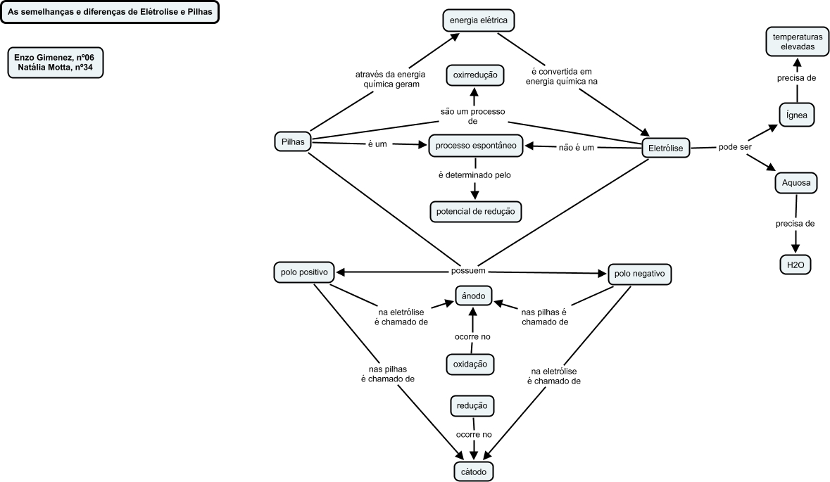 Esse mapa conceitual, produzido no IHMC CmapTools, tem a informação relacionada a: Trab Química Natália Enzo 2B, Pilhas são um processo de oxirredução, polo negativo na eletrólise é chamado de cátodo, Eletrólise possuem polo negativo, redução ocorre no cátodo, Pilhas possuem polo negativo, polo negativo nas pilhas é chamado de ânodo, Eletrólise pode ser Aquosa, energia elétrica é convertida em energia química na Eletrólise, Eletrólise são um processo de oxirredução, Ígnea precisa de temperaturas elevadas, Eletrólise possuem polo positivo, oxidação ocorre no ânodo, processo espontâneo é determinado pelo potencial de redução, Eletrólise não é um processo espontâneo, Eletrólise pode ser Ígnea, Pilhas é um processo espontâneo, Pilhas através da energia química geram energia elétrica, polo positivo nas pilhas é chamado de cátodo, Aquosa precisa de H2O, polo positivo na eletrólise é chamado de ânodo