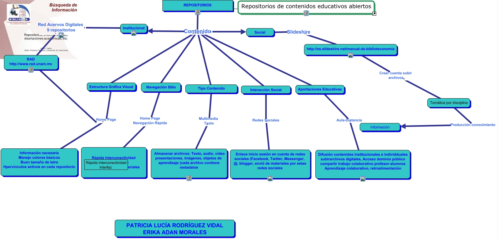 Este Cmap, tiene información relacionada con: Modelo de Conocimiento, REPOSITORIOS Contenido Aportaciones Educativas, REPOSITORIOS Contenido Navegación Sitio, http://es.slideshire.net/manual-de-biblioteconomía Crear cuenta subir archivos Temática por disciplina, Aportaciones Educativas Aula-Distancia Difusión contenidos institucionales e individduales subirarchivos digitales, Acceso dominio público compartir trabajo colaborativo profesor-alumnos Aprendizaje colaborativo, retroalimentación, Interacción Social Redes Sociales Enlace inicio sesión en cuenta de redes sociales (Facebook, Twitter, Messenger, @, blogger, envió de materiales por estas redes sociales, REPOSITORIOS Contenido ????, RAD http://www.rad.unam.mx Home Page Información necesaria Manejo colores básicos Buen tamaño de letra Hpervínculos activos en cada repositorio, REPOSITORIOS Contenido Tipo Contenido, Institucional Red Acervos Digitales 9 repositorios RAD http://www.rad.unam.mx, Temática por disciplina Producción conocimiento Información, Social Slideshire http://es.slideshire.net/manual-de-biblioteconomía, Tipo Contenido Multimedia Texto Almacenar archivos: Texto, audio, vídeo presentaciones, imágenes, objetos de aprendizaje (cada archivo contiene metadatos, REPOSITORIOS Contenido Social, Repositorios de contenidos educativos abiertos ???? REPOSITORIOS, Estructura Gráfica Visual Home Page Información necesaria Manejo colores básicos Buen tamaño de letra Hpervínculos activos en cada repositorio, REPOSITORIOS Contenido Estructura Gráfica Visual, REPOSITORIOS Contenido Institucional, Navegación Sitio Home Page Navegación Rápida Rápida Interconectividad Interfaz
