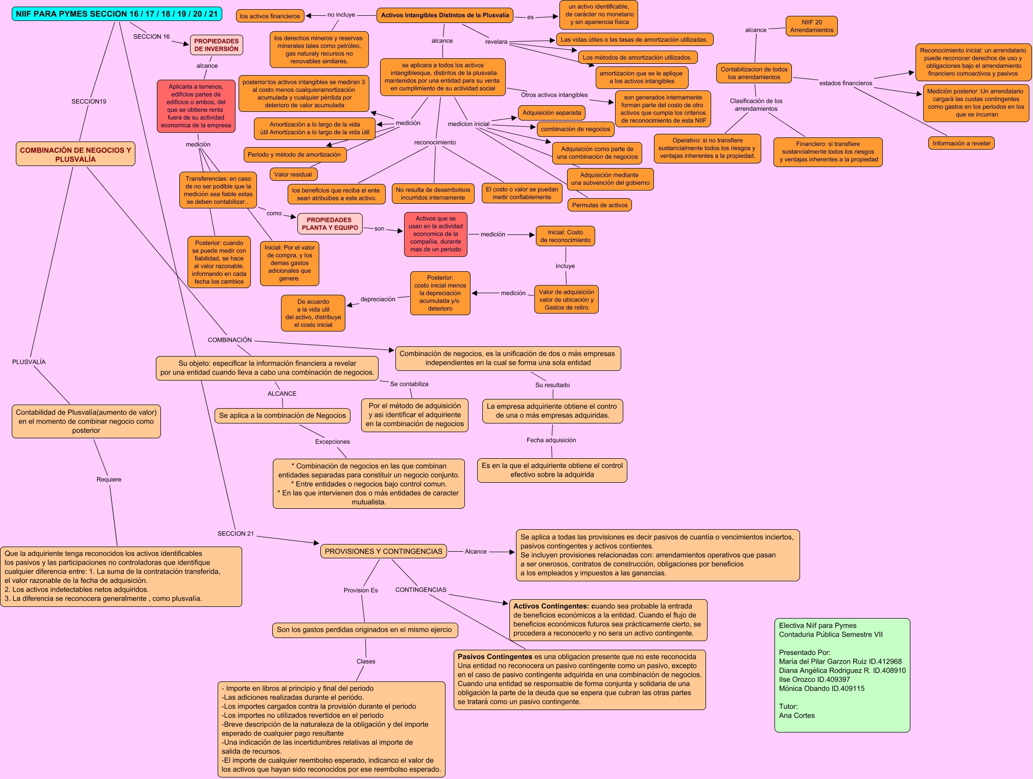 Este Cmap, tiene información relacionada con: Secciones 16 a 21, se aplicara a todos los activos intangiblesque, distintos de la plusvalia mantenidos por una entidad para su venta en cumplimiento de su actividad social medición Amortización a lo largo de la vida útil Amortización a lo largo de la vida útil, PROVISIONES Y CONTINGENCIAS Alcance Se aplica a todas las provisiones es decir pasivos de cuantía o vencimientos inciertos, pasivos contingentes y activos contientes. Se incluyen provisiones relacionadas con: arrendamientos operativos que pasan a ser onerosos, contratos de construcción, obligaciones por beneficios a los empleados y impuestos a las ganancias., Activos Intangibles Distintos de la Plusvalía revelara amortizacion que se le aplique a los activos intangibles, Transferencias: en caso de no ser podible que la medición sea fiable estas se deben contabilizar.. como PROPIEDADES PLANTA Y EQUIPO, Activos Intangibles Distintos de la Plusvalía revelara Los métodos de amortización utilizados., Activos Intangibles Distintos de la Plusvalía no incluye los derechos mineros y reservas minerales tales como petróleo, gas naturaly recursos no renovables similares., Contabilidad de Plusvalía(aumento de valor) en el momento de combinar negocio como posterior Requiere Que la adquiriente tenga reconocidos los activos identificables los pasivos y las participaciones no controladoras que identifique cualquier diferencia entre: 1. La suma de la contratación transferida, el valor razonable de la fecha de adquisición. 2. Los activos indetectables netos adquiridos. 3. La diferencia se reconocera generalmente , como plusvalía., Activos Intangibles Distintos de la Plusvalía revelara Las vidas útiles o las tasas de amortización utilizadas., Contabilizacion de todos los arrendamientos estados financieros Información a revelar, Inicial: Costo de reconocimiento incluye Valor de adquisición valor de ubicación y Gastos de retiro, Son los gastos perdidas originados en el mismo ejercio Clases - Importe en libros al principio y final del periodo -Las adiciones realizadas durante el periódo. -Los importes cargados contra la provisión durante el periodo -Los importes no utilizados revertidos en el periodo -Breve descripción de la naturaleza de la obligación y del importe esperado de cualquier pago resultante -Una indicación de las incertidumbres relativas al importe de salida de recursos. -El importe de cualquier reembolso esperado, indicanco el valor de los activos que hayan sido reconocidos por ese reembolso esperado., COMBINACIÓN DE NEGOCIOS Y PLUSVALÍA PLUSVALÍA Contabilidad de Plusvalía(aumento de valor) en el momento de combinar negocio como posterior, Aplicarla a terrenos, edificios partes de edificios o ambos, del que se obtiene renta fuera de su actividad economica de la empresa medición Inicial: Por el valor de compra, y los demas gastos adicionales que genere., La empresa adquiriente obtiene el contro de una o más empresas adquiridas. Fecha adquisición Es en la que el adquiriente obtiene el control efectivo sobre la adquirida, se aplicara a todos los activos intangiblesque, distintos de la plusvalia mantenidos por una entidad para su venta en cumplimiento de su actividad social medición Periodo y método de amortización, Su objeto: especificar la información financiera a revelar por una entidad cuando lleva a cabo una combinación de negocios. ALCANCE Se aplica a la combinación de Negocios, Activos que se usan en la actividad economica de la compañia, durante mas de un periodo medición Inicial: Costo de reconocimiento, NIIF PARA PYMES SECCION 16 / 17 / 18 / 19 / 20 / 21 SECCION 16 PROPIEDADES DE INVERSIÓN, Contabilizacion de todos los arrendamientos estados financieros Reconocimiento inicial: un arrendatario puede reconocer derechos de uso y obligaciones bajo el arrendamiento financiero comoactivos y pasivos, COMBINACIÓN DE NEGOCIOS Y PLUSVALÍA COMBINACIÓN Su objeto: especificar la información financiera a revelar por una entidad cuando lleva a cabo una combinación de negocios.