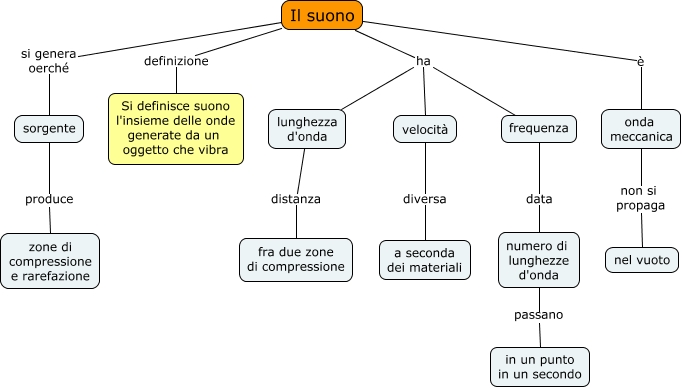 Questa Cmap, creata con IHMC CmapTools, contiene informazioni relative a: Suono, velocità diversa a seconda dei materiali, Il suono è onda meccanica, Il suono ha velocità, Il suono si genera oerché sorgente, sorgente produce zone di compressione e rarefazione, numero di lunghezze d'onda passano in un punto in un secondo, Il suono definizione Si definisce suono l'insieme delle onde generate da un oggetto che vibra, Il suono ha lunghezza d'onda, lunghezza d'onda distanza fra due zone di compressione, frequenza data numero di lunghezze d'onda, onda meccanica non si propaga nel vuoto, Il suono ha frequenza