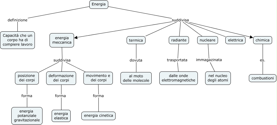 Questa Cmap, creata con IHMC CmapTools, contiene informazioni relative a: Energia, termica dovuta al moto delle molecole, deformazione dei corpi forma energia elastica, Energia suddivisa chimica, chimica es. combustioni, energia meccanica suddivisa deformazione dei corpi, Energia definizione Capacità che un corpo ha di compiere lavoro, radiante trasportata dalle onde elettromagnetiche, energia meccanica suddivisa posizione dei corpi, Energia suddivisa nucleare, nucleare immagazinata nel nucleo degli atomi, movimento e dei corpi forma energia cinetica, Energia suddivisa termica, Energia suddivisa energia meccanica, Energia suddivisa radiante, posizione dei corpi forma energia potanziale gravitazionale, energia meccanica suddivisa movimento e dei corpi, Energia suddivisa elettrica