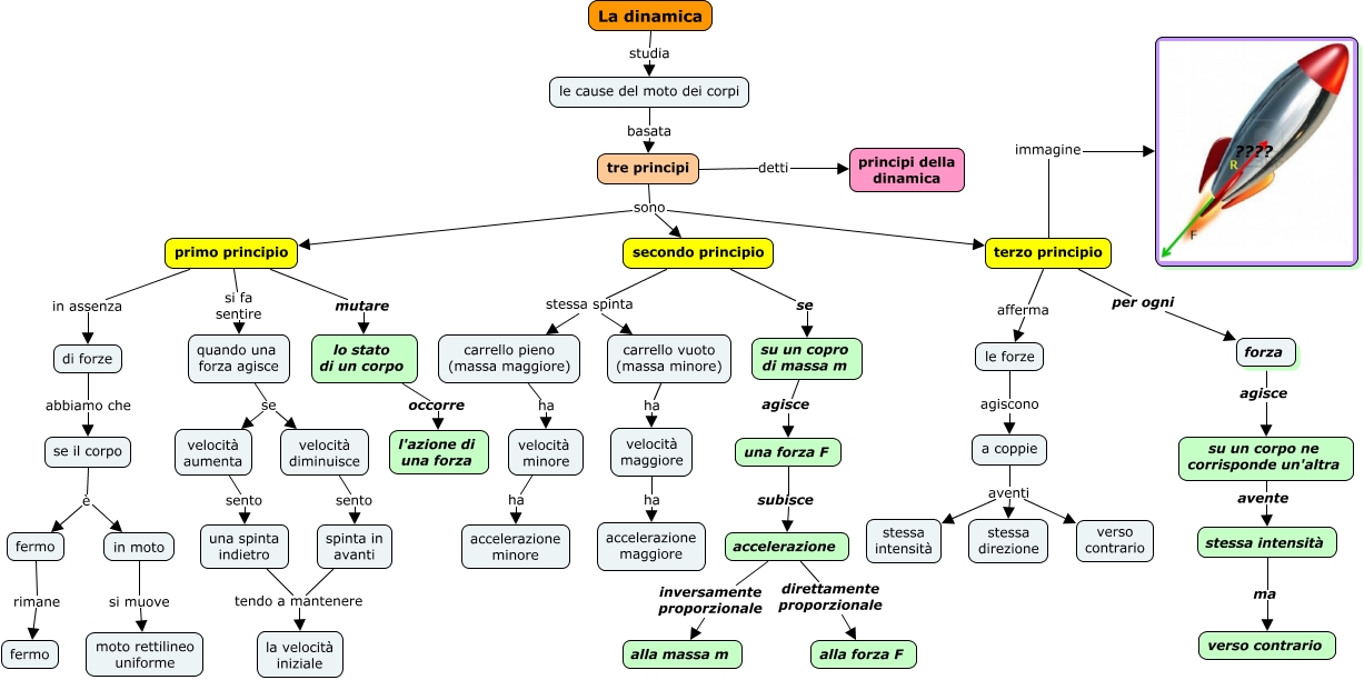 Questa Cmap, creata con IHMC CmapTools, contiene informazioni relative a: La dinamica, spinta in avanti tendo a mantenere la velocità iniziale, terzo principio per ogni forza, le cause del moto dei corpi basata tre principi, primo principio si fa sentire quando una forza agisce, forza agisce su un corpo ne corrisponde un'altra, primo principio mutare lo stato di un corpo, quando una forza agisce se velocità diminuisce, La dinamica studia le cause del moto dei corpi, su un copro di massa m agisce una forza F, terzo principio immagine ????, tre principi sono secondo principio, secondo principio stessa spinta carrello pieno (massa maggiore), velocità maggiore ha accelerazione maggiore, se il corpo è in moto, velocità minore ha accelerazione minore, primo principio in assenza di forze, terzo principio afferma le forze, una forza F subisce accelerazione, velocità aumenta sento una spinta indietro, tre principi detti principi della dinamica