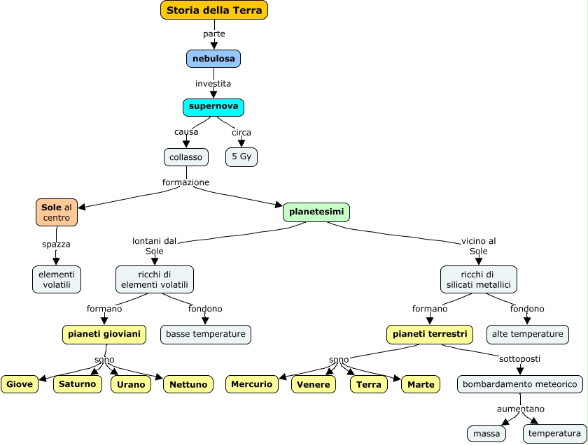 Questa Cmap, creata con IHMC CmapTools, contiene informazioni relative a: 1.3 Le origini del pianeta Terra, Sole al centro spazza elementi volatili, pianeti gioviani sono Urano, nebulosa investita supernova, collasso formazione Sole al centro, bombardamento meteorico aumentano massa, ricchi di silicati metallici formano pianeti terrestri, bombardamento meteorico aumentano temperatura, pianeti terrestri sono Marte, ricchi di silicati metallici fondono alte temperature, pianeti gioviani sono Saturno, collasso formazione planetesimi, pianeti terrestri sono Mercurio, pianeti gioviani sono Nettuno, planetesimi vicino al Sole ricchi di silicati metallici, supernova circa 5 Gy, ricchi di elementi volatili formano pianeti gioviani, pianeti terrestri sottoposti bombardamento meteorico, planetesimi lontani dal Sole ricchi di elementi volatili, pianeti terrestri sono Venere, pianeti terrestri sono Terra