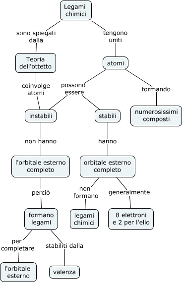 Questa Cmap, creata con IHMC CmapTools, contiene informazioni relative a: 6.5 Legami Chimici saperi essenziali, atomi possono essere stabili, atomi formando numerosissimi composti, l'orbitale esterno completo perciò formano legami, formano legami stabiliti dalla valenza, atomi possono essere instabili, Teoria dell'ottetto coinvolge atomi instabili, Legami chimici sono spiegati dalla Teoria dell'ottetto, orbitale esterno completo non formano legami chimici, stabili hanno orbitale esterno completo, formano legami per completare l'orbitale esterno, orbitale esterno completo generalmente 8 elettroni e 2 per l'elio, instabili non hanno l'orbitale esterno completo, Legami chimici tengono uniti atomi