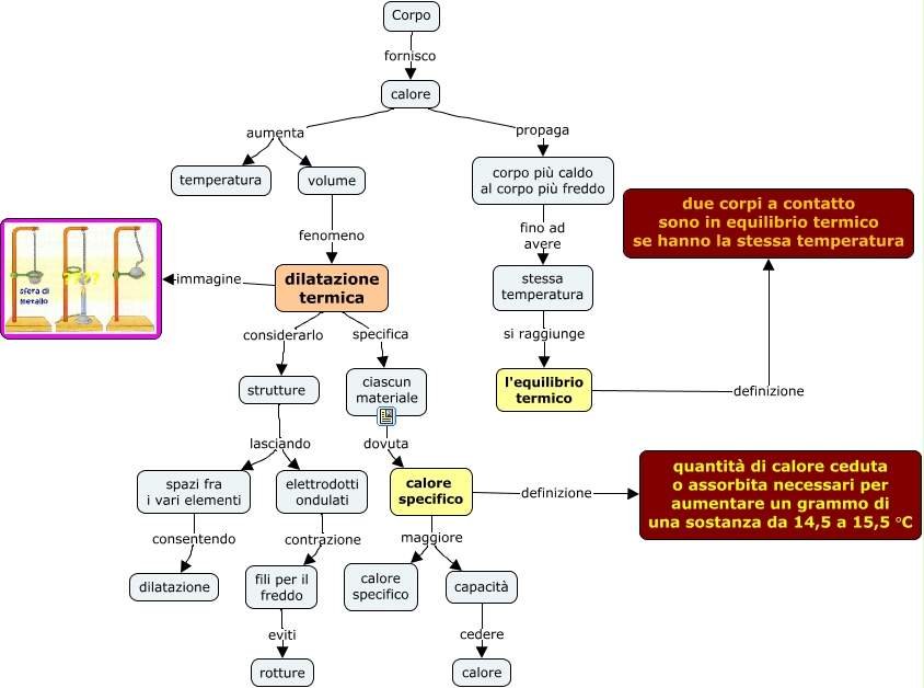 Questa Cmap, creata con IHMC CmapTools, contiene informazioni relative a: 4.1 dilatazione termica, strutture lasciando spazi fra i vari elementi, l'equilibrio termico definizione due corpi a contatto sono in equilibrio termico se hanno la stessa temperatura, fili per il freddo eviti rotture, corpo più caldo al corpo più freddo fino ad avere stessa temperatura, Corpo fornisco calore, stessa temperatura si raggiunge l'equilibrio termico, calore specifico maggiore capacità, calore propaga corpo più caldo al corpo più freddo, strutture lasciando elettrodotti ondulati, calore specifico maggiore calore specifico, calore specifico definizione quantità di calore ceduta o assorbita necessari per aumentare un grammo di una sostanza da 14,5 a 15,5 °C, volume fenomeno dilatazione termica, capacità cedere calore, spazi fra i vari elementi consentendo dilatazione, calore aumenta temperatura, elettrodotti ondulati contrazione fili per il freddo, dilatazione termica immagine ????, calore aumenta volume, dilatazione termica considerarlo strutture, dilatazione termica specifica ciascun materiale
