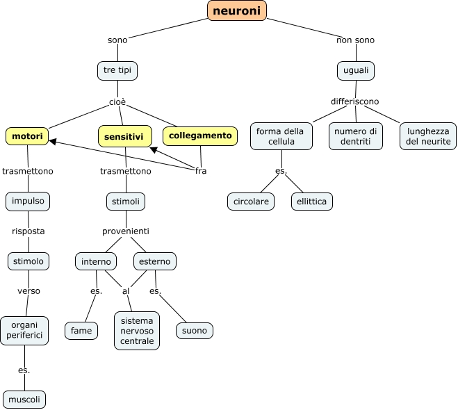Questa Cmap, creata con IHMC CmapTools, contiene informazioni relative a: 04 tipi di neuroni, neuroni sono tre tipi, impulso risposta stimolo, collegamento fra motori, tre tipi cioè collegamento, tre tipi cioè sensitivi, forma della cellula es. ellittica, interno es. fame, esterno al sistema nervoso centrale, organi periferici es. muscoli, collegamento fra sensitivi, motori trasmettono impulso, sensitivi trasmettono stimoli, stimoli provenienti interno, esterno es. suono, uguali differiscono lunghezza del neurite, stimolo verso organi periferici, uguali differiscono forma della cellula, forma della cellula es. circolare, stimoli provenienti esterno, tre tipi cioè motori