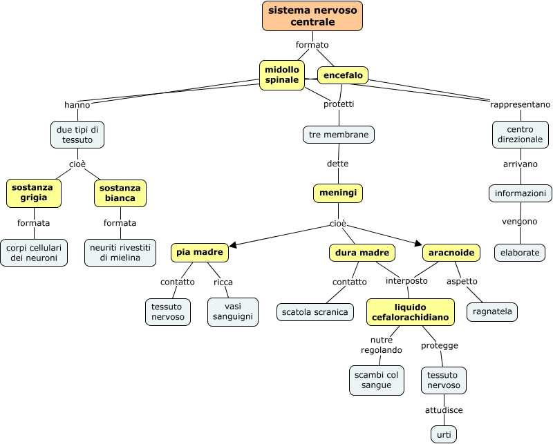 Questa Cmap, creata con IHMC CmapTools, contiene informazioni relative a: 06 Il sistema nervoso centrale, pia madre contatto tessuto nervoso, aracnoide aspetto ragnatela, sostanza grigia formata corpi cellulari dei neuroni, encefalo rappresentano centro direzionale, meningi cioè pia madre, pia madre ricca vasi sanguigni, informazioni vengono elaborate, sistema nervoso centrale formato encefalo, encefalo hanno due tipi di tessuto, meningi cioè aracnoide, dura madre contatto scatola scranica, tre membrane dette meningi, liquido cefalorachidiano nutre regolando scambi col sangue, dura madre interposto liquido cefalorachidiano, midollo spinale hanno due tipi di tessuto, due tipi di tessuto cioè sostanza bianca, due tipi di tessuto cioè sostanza grigia, aracnoide interposto liquido cefalorachidiano, centro direzionale arrivano informazioni, tessuto nervoso attudisce urti