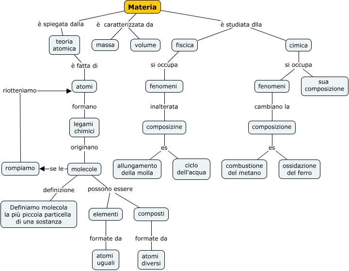 Questa Cmap, creata con IHMC CmapTools, contiene informazioni relative a: Cap. 2.4 Mappa Saperi essenziali DSA materia, rompiamo riotteniamo atomi, molecole definizione Definiamo molecola la più piccola particella di una sostanza, fenomeni cambiano la composizione, composizine es ciclo dell'acqua, composti formate da atomi diversi, fenomeni inalterata composizine, Materia è studiata dlla fiscica, Materia è caratterizzata da massa, composizione es ossidazione del ferro, molecole se le rompiamo, elementi formate da atomi uguali, cimica si occupa sua composizione, Materia è studiata dlla cimica, legami chimici originano molecole, cimica si occupa fenomeni, fiscica si occupa fenomeni, atomi formano legami chimici, molecole possono essere elementi, composizine es allungamento della molla, Materia è spiegata dalla teoria atomica