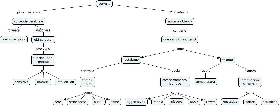 Questa Cmap, creata con IHMC CmapTools, contiene informazioni relative a: 08 Cervello, lobi cerebrali svolgono funzioni ben precise, corteccia cerebrale suddivisa lobi cerebrali, comportamento istintivo come ansia, stimoli interni come sete, stimoli interni come stanchezza, cervello più interna sostanza bianca, comportamento istintivo come aggressività, comportamento istintivo come paura, comportamento istintivo come piacere, ipotalamo controlla stimoli interni, stimoli interni come sonno, talamo elabora informazioni sensoriali, funzioni ben precise es. sensitive, informazioni sensoriali come acustiche, cervello più superficiale corteccia cerebrale, ipotalamo regola comportamento istintivo, comportamento istintivo come rabbia, due centri importanti come ipotalamo, corteccia cerebrale formata sostanza grigia, talamo regola temperatura