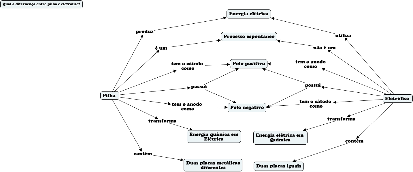 Esse mapa conceitual, produzido no IHMC CmapTools, tem a informação relacionada a: Qual a diferença entre eletrólise e pilha Antonio e Rafael, Eletrólise possui Polo positivo, Eletrólise transforma Energia elétrica em Química, Pilha possui Polo negativo, Pilha produz Energia elétrica, Pilha tem o anodo como Polo negativo, Eletrólise utiliza Energia elétrica, Eletrólise tem o anodo como Polo positivo, Pilha contém Duas placas metálicas diferentes, Eletrólise não é um Processo espontaneo, Pilha transforma Energia química em Elétrica, Eletrólise possui Polo negativo, Eletrólise tem o cátodo como Polo negativo, Pilha tem o cátodo como Polo positivo, Pilha é um Processo espontaneo, Pilha possui Polo positivo, Eletrólise contém Duas placas iguais