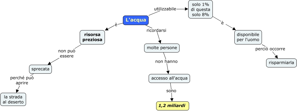 Questa Cmap, creata con IHMC CmapTools, contiene informazioni relative a: 5.6 L'acqua una risorsa preziosa, disponibile per l'uomo perciò occorre risparmiarla, accesso all'acqua sono 1,2 miliardi, sprecata perché può aprire la strada al deserto, L'acqua è risorsa preziosa, L'acqua utilizzabile solo 1% di questa solo 8%, solo 1% di questa solo 8% è disponibile per l'uomo, L'acqua ricordarsi molte persone, risorsa preziosa non può essere sprecata, molte persone non hanno accesso all'acqua