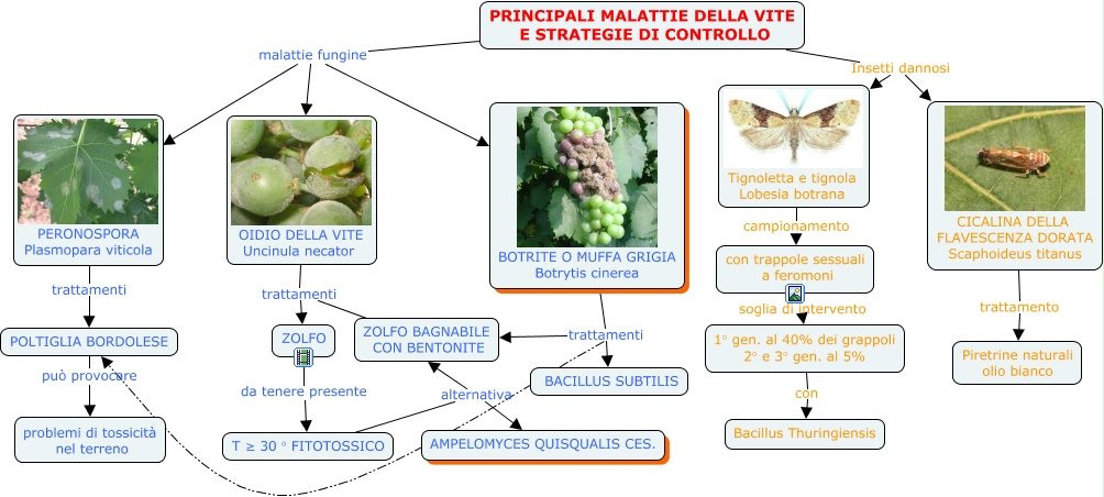 Questa Cmap, creata con IHMC CmapTools, contiene informazioni relative a: malattie, T ≥ 30 ° FITOTOSSICO alternativa ZOLFO BAGNABILE CON BENTONITE, T ≥ 30 ° FITOTOSSICO alternativa AMPELOMYCES QUISQUALIS CES., BOTRITE O MUFFA GRIGIA Botrytis cinerea trattamenti BACILLUS SUBTILIS, con trappole sessuali a feromoni soglia di intervento 1° gen. al 40% dei grappoli 2° e 3° gen. al 5%, PRINCIPALI MALATTIE DELLA VITE E STRATEGIE DI CONTROLLO Insetti dannosi Tignoletta e tignola Lobesia botrana, PERONOSPORA Plasmopara viticola trattamenti POLTIGLIA BORDOLESE, CICALINA DELLA FLAVESCENZA DORATA Scaphoideus titanus trattamento Piretrine naturali olio bianco, ZOLFO da tenere presente T ≥ 30 ° FITOTOSSICO, PRINCIPALI MALATTIE DELLA VITE E STRATEGIE DI CONTROLLO malattie fungine OIDIO DELLA VITE Uncinula necator, PRINCIPALI MALATTIE DELLA VITE E STRATEGIE DI CONTROLLO malattie fungine BOTRITE O MUFFA GRIGIA Botrytis cinerea, 1° gen. al 40% dei grappoli 2° e 3° gen. al 5% con Bacillus Thuringiensis, OIDIO DELLA VITE Uncinula necator trattamenti ZOLFO, BOTRITE O MUFFA GRIGIA Botrytis cinerea trattamenti POLTIGLIA BORDOLESE, Tignoletta e tignola Lobesia botrana campionamento con trappole sessuali a feromoni, PRINCIPALI MALATTIE DELLA VITE E STRATEGIE DI CONTROLLO Insetti dannosi CICALINA DELLA FLAVESCENZA DORATA Scaphoideus titanus, BOTRITE O MUFFA GRIGIA Botrytis cinerea trattamenti ZOLFO BAGNABILE CON BENTONITE, PRINCIPALI MALATTIE DELLA VITE E STRATEGIE DI CONTROLLO malattie fungine PERONOSPORA Plasmopara viticola, POLTIGLIA BORDOLESE può provocare problemi di tossicità nel terreno, OIDIO DELLA VITE Uncinula necator trattamenti ZOLFO BAGNABILE CON BENTONITE