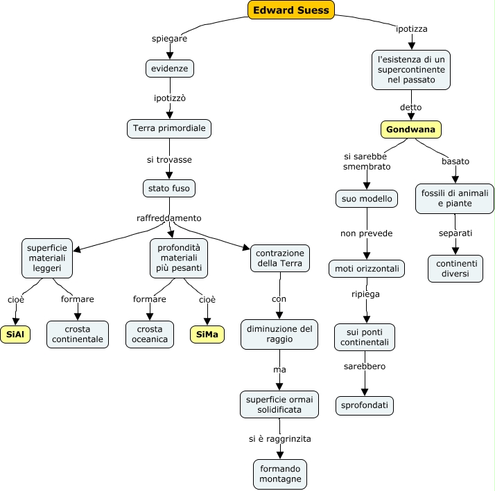 Questa Cmap, creata con IHMC CmapTools, contiene informazioni relative a: 2.2 Edward Suess, Gondwana basato fossili di animali e piante, Terra primordiale si trovasse stato fuso, Edward Suess ipotizza l'esistenza di un supercontinente nel passato, Gondwana si sarebbe smembrato suo modello, suo modello non prevede moti orizzontali, stato fuso raffreddamento contrazione della Terra, evidenze ipotizzò Terra primordiale, profondità materiali più pesanti formare crosta oceanica, Edward Suess spiegare evidenze, stato fuso raffreddamento superficie materiali leggeri, profondità materiali più pesanti cioè SiMa, superficie materiali leggeri formare crosta continentale, diminuzione del raggio ma superficie ormai solidificata, moti orizzontali ripiega sui ponti continentali, contrazione della Terra con diminuzione del raggio, superficie materiali leggeri cioè SiAl, l'esistenza di un supercontinente nel passato detto Gondwana, stato fuso raffreddamento profondità materiali più pesanti, fossili di animali e piante separati continenti diversi, sui ponti continentali sarebbero sprofondati