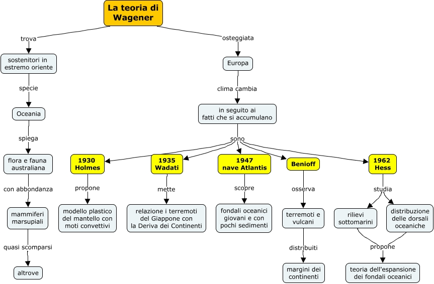 Questa Cmap, creata con IHMC CmapTools, contiene informazioni relative a: 2.5 Dopo Wegener, flora e fauna australiana con abbondanza mammiferi marsupiali, mammiferi marsupiali quasi scomparsi altrove, 1935 Wadati mette relazione i terremoti del Giappone con la Deriva dei Continenti, in seguito ai fatti che si accumulano sono Benioff, sostenitori in estremo oriente specie Oceania, La teoria di Wagener osteggiata Europa, La teoria di Wagener trova sostenitori in estremo oriente, in seguito ai fatti che si accumulano sono 1935 Wadati, Benioff osserva terremoti e vulcani, in seguito ai fatti che si accumulano sono 1947 nave Atlantis, Oceania spiega flora e fauna australiana, Europa clima cambia in seguito ai fatti che si accumulano, in seguito ai fatti che si accumulano sono 1930 Holmes, terremoti e vulcani distribuiti margini dei continenti, rilievi sottomarini propone teoria dell'espansione dei fondali oceanici, 1947 nave Atlantis scopre fondali oceanici giovani e con pochi sedimenti, distribuzione delle dorsali oceaniche propone teoria dell'espansione dei fondali oceanici, 1962 Hess studia rilievi sottomarini, in seguito ai fatti che si accumulano sono 1962 Hess, 1930 Holmes propone modello plastico del mantello con moti convettivi