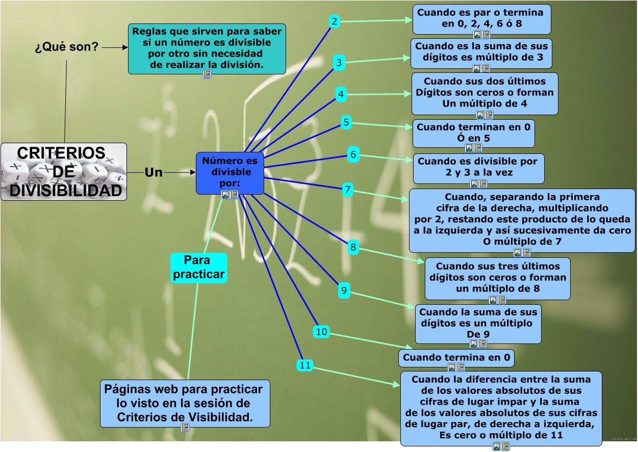 Este Cmap, tiene información relacionada con: Criterios de divisibilidad, Número es divisble por: 9 Cuando la suma de sus dígitos es un múltiplo De 9, Número es divisble por: 8 Cuando sus tres últimos dígitos son ceros o forman un múltiplo de 8, Número es divisble por: 11 Cuando la diferencia entre la suma de los valores absolutos de sus cifras de lugar impar y la suma de los valores absolutos de sus cifras de lugar par, de derecha a izquierda, Es cero o múltiplo de 11, CRITERIOS DE DIVISIBILIDAD Un Número es divisble por:, Número es divisble por: 10 Cuando termina en 0, Número es divisble por: 7 Cuando, separando la primera cifra de la derecha, multiplicando por 2, restando este producto de lo queda a la izquierda y así sucesivamente da cero O múltiplo de 7, CRITERIOS DE DIVISIBILIDAD ¿Qué son? Reglas que sirven para saber si un número es divisible por otro sin necesidad de realizar la división., Número es divisble por: 3 Cuando es la suma de sus dígitos es múltiplo de 3, Número es divisble por: Para practicar Páginas web para practicar lo visto en la sesión de Criterios de Visibilidad., Número es divisble por: 2 Cuando es par o termina en 0, 2, 4, 6 ó 8, Número es divisble por: 6 Cuando es divisible por 2 y 3 a la vez, Número es divisble por: 5 Cuando terminan en 0 Ó en 5, Número es divisble por: 4 Cuando sus dos últimos Dígitos son ceros o forman Un múltiplo de 4