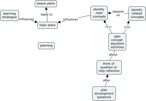 This Concept Map, created with IHMC CmapTools, has information related to: planning lessons & topic, teaching strategies influences topic plans, topic plans leads to lesson plans, plan concept aquistion activities about think of question to help reflection, plan concept aquistion activities ???? identify related concepts, identify related concepts depend on identify main concepts, plan development questions after think of question to help reflection, plan concept aquistion activities ???? identify main concepts, identify main concepts influences topic plans