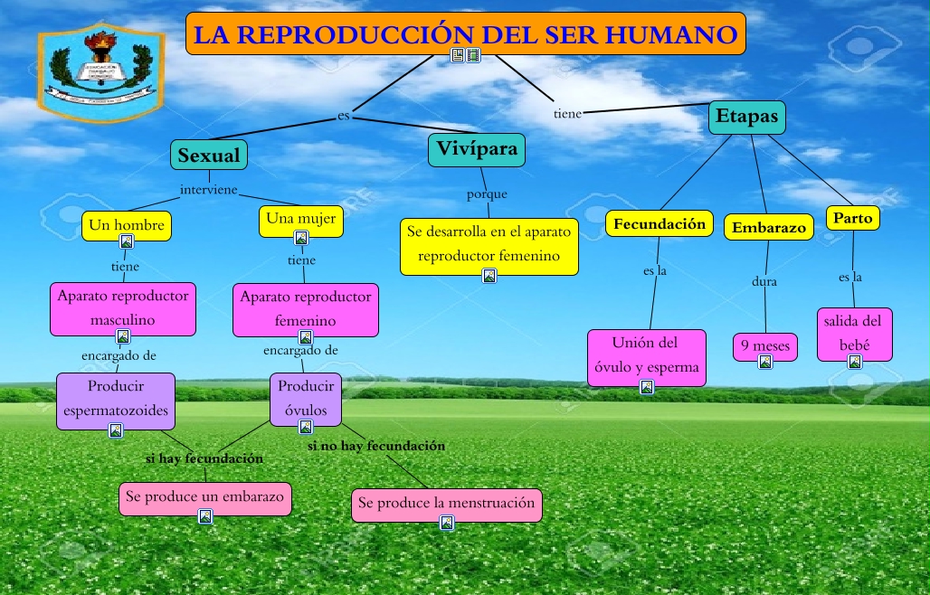 Este Cmap, tiene información relacionada con: la reproducción del Ser humano, Producir espermatozoides si hay fecundación Se produce un embarazo, Embarazo dura 9 meses, Fecundación es la Unión del óvulo y esperma, LA REPRODUCCIÓN DEL SER HUMANO es Vivípara, Producir óvulos si hay fecundación Se produce un embarazo, Aparato reproductor femenino encargado de Producir óvulos, Sexual interviene Una mujer, Aparato reproductor masculino encargado de Producir espermatozoides, Sexual interviene Un hombre, Etapas Parto, Un hombre tiene Aparato reproductor masculino, Una mujer tiene Aparato reproductor femenino, LA REPRODUCCIÓN DEL SER HUMANO es Sexual, LA REPRODUCCIÓN DEL SER HUMANO tiene Etapas, Etapas Embarazo, Parto es la salida del bebé, Producir óvulos si no hay fecundación Se produce la menstruación, Vivípara porque Se desarrolla en el aparato reproductor femenino, Etapas Fecundación