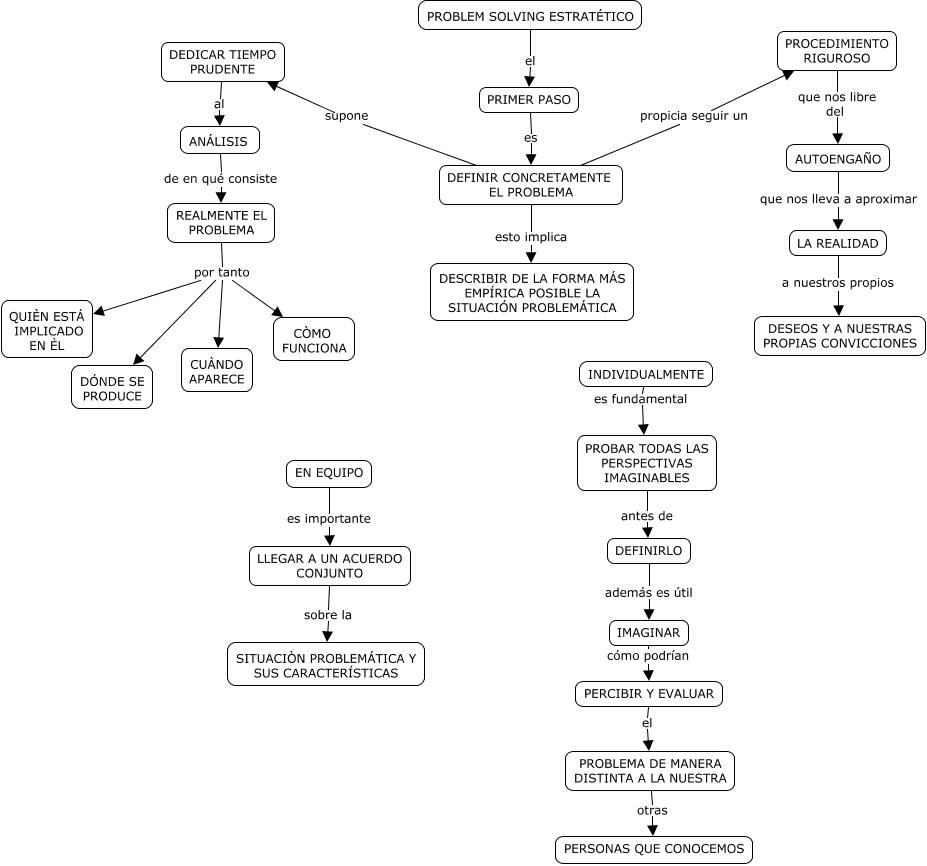 Este Cmap, tiene información relacionada con: PROBLEM SOLVING ESTRATÉTICO, REALMENTE EL PROBLEMA por tanto DÓNDE SE PRODUCE, IMAGINAR cómo podrían PERCIBIR Y EVALUAR, PROBLEM SOLVING ESTRATÉTICO el PRIMER PASO, EN EQUIPO es importante LLEGAR A UN ACUERDO CONJUNTO, INDIVIDUALMENTE es fundamental PROBAR TODAS LAS PERSPECTIVAS IMAGINABLES, REALMENTE EL PROBLEMA por tanto CUÀNDO APARECE, AUTOENGAÑO que nos lleva a aproximar LA REALIDAD, DEFINIR CONCRETAMENTE EL PROBLEMA supone DEDICAR TIEMPO PRUDENTE, LLEGAR A UN ACUERDO CONJUNTO sobre la SITUACIÒN PROBLEMÁTICA Y SUS CARACTERÍSTICAS, REALMENTE EL PROBLEMA por tanto CÒMO FUNCIONA, DEDICAR TIEMPO PRUDENTE al ANÁLISIS, DEFINIR CONCRETAMENTE EL PROBLEMA propicia seguir un PROCEDIMIENTO RIGUROSO, PROBLEMA DE MANERA DISTINTA A LA NUESTRA otras PERSONAS QUE CONOCEMOS, PRIMER PASO es DEFINIR CONCRETAMENTE EL PROBLEMA, PROBAR TODAS LAS PERSPECTIVAS IMAGINABLES antes de DEFINIRLO, LA REALIDAD a nuestros propios DESEOS Y A NUESTRAS PROPIAS CONVICCIONES, ANÁLISIS de en qué consiste REALMENTE EL PROBLEMA, DEFINIRLO además es útil IMAGINAR, PROCEDIMIENTO RIGUROSO que nos libre del AUTOENGAÑO, REALMENTE EL PROBLEMA por tanto QUIÈN ESTÁ IMPLICADO EN ÈL