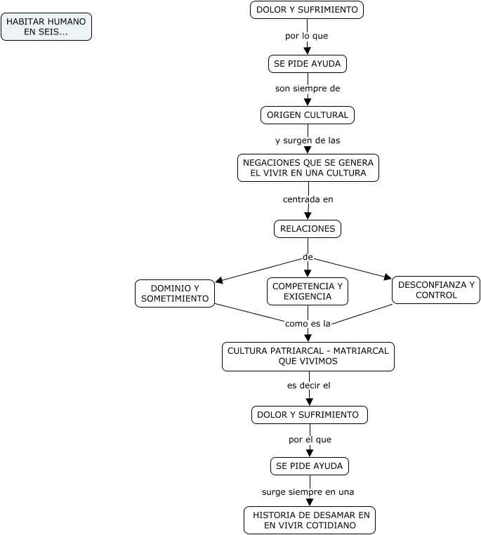 Este Cmap, tiene información relacionada con: Dolor y sufrimiento, RELACIONES de DOMINIO Y SOMETIMIENTO, CULTURA PATRIARCAL - MATRIARCAL QUE VIVIMOS es decir el DOLOR Y SUFRIMIENTO, NEGACIONES QUE SE GENERA EL VIVIR EN UNA CULTURA centrada en RELACIONES, DESCONFIANZA Y CONTROL como es la CULTURA PATRIARCAL - MATRIARCAL QUE VIVIMOS, SE PIDE AYUDA surge siempre en una HISTORIA DE DESAMAR EN EN VIVIR COTIDIANO, DOLOR Y SUFRIMIENTO por lo que SE PIDE AYUDA, RELACIONES de DESCONFIANZA Y CONTROL, COMPETENCIA Y EXIGENCIA como es la CULTURA PATRIARCAL - MATRIARCAL QUE VIVIMOS, SE PIDE AYUDA son siempre de ORIGEN CULTURAL, ORIGEN CULTURAL y surgen de las NEGACIONES QUE SE GENERA EL VIVIR EN UNA CULTURA, DOMINIO Y SOMETIMIENTO como es la CULTURA PATRIARCAL - MATRIARCAL QUE VIVIMOS, DOLOR Y SUFRIMIENTO por el que SE PIDE AYUDA, RELACIONES de COMPETENCIA Y EXIGENCIA
