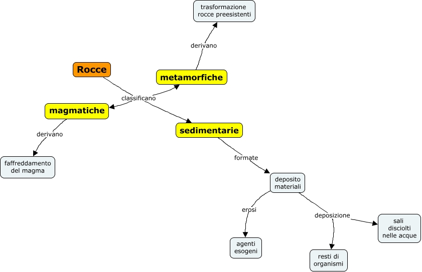 Questa Cmap, creata con IHMC CmapTools, contiene informazioni relative a: 11.03 Classificazione delle rocce, metamorfiche derivano trasformazione rocce preesistenti, deposito materiali deposizione resti di organismi, deposito materiali erosi agenti esogeni, sedimentarie formate deposito materiali, Rocce classificano sedimentarie, Rocce classificano metamorfiche, Rocce classificano magmatiche, magmatiche derivano faffreddamento del magma, deposito materiali deposizione sali disciolti nelle acque