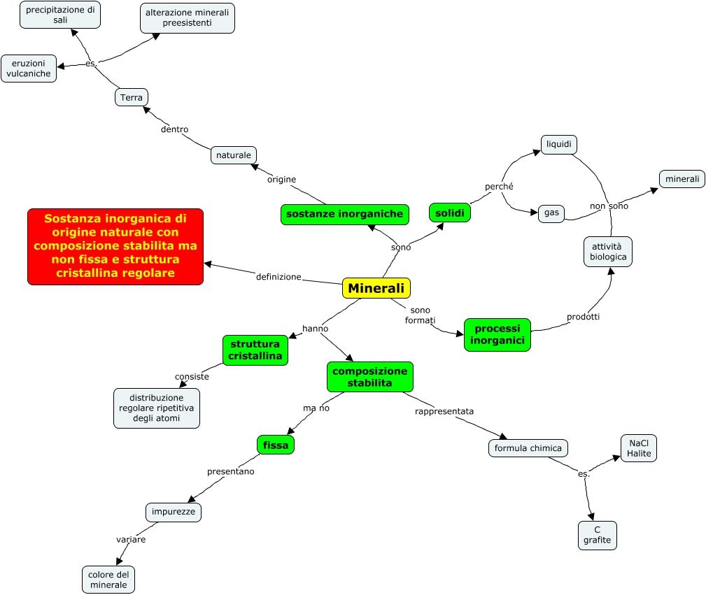 Questa Cmap, creata con IHMC CmapTools, contiene informazioni relative a: 10.2 Minerali, attività biologica non sono minerali, formula chimica es. NaCl Halite, fissa presentano impurezze, Terra es. alterazione minerali preesistenti, solidi perché gas, struttura cristallina consiste distribuzione regolare ripetitiva degli atomi, impurezze variare colore del minerale, processi inorganici prodotti attività biologica, liquidi non sono minerali, sostanze inorganiche origine naturale, composizione stabilita ma no fissa, Terra es. eruzioni vulcaniche, gas non sono minerali, formula chimica es. C grafite, naturale dentro Terra, Minerali sono formati processi inorganici, Minerali sono solidi, Minerali hanno composizione stabilita, Terra es. precipitazione di sali, Minerali definizione Sostanza inorganica di origine naturale con composizione stabilita ma non fissa e struttura cristallina regolare