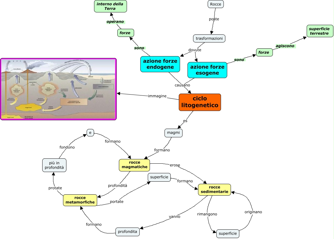 Questa Cmap, creata con IHMC CmapTools, contiene informazioni relative a: 11.11 Ciclo litogenetico, Rocce poste trasformazioni, ciclo litogenetico immagine, superficie originano rocce sedimentarie, rocce sedimentarie vanno profondita, azione forze esogene causano ciclo litogenetico, superficie formano rocce sedimentarie, rocce sedimentarie rimangono superficie, profondita formano rocce metamorfiche, azione forze esogene sono forze, rocce metamorfiche protate più in profondità, trasformazioni dovute azione forze esogene, forze operano interno della Terra, forze agiscono superficie terrestre, ciclo litogenetico es magmi, rocce magmatiche profondità rocce metamorfiche, magmi formano rocce magmatiche, rocce metamorfiche portate superficie, e formano rocce magmatiche, più in profondità fondono e, trasformazioni dovute azione forze endogene