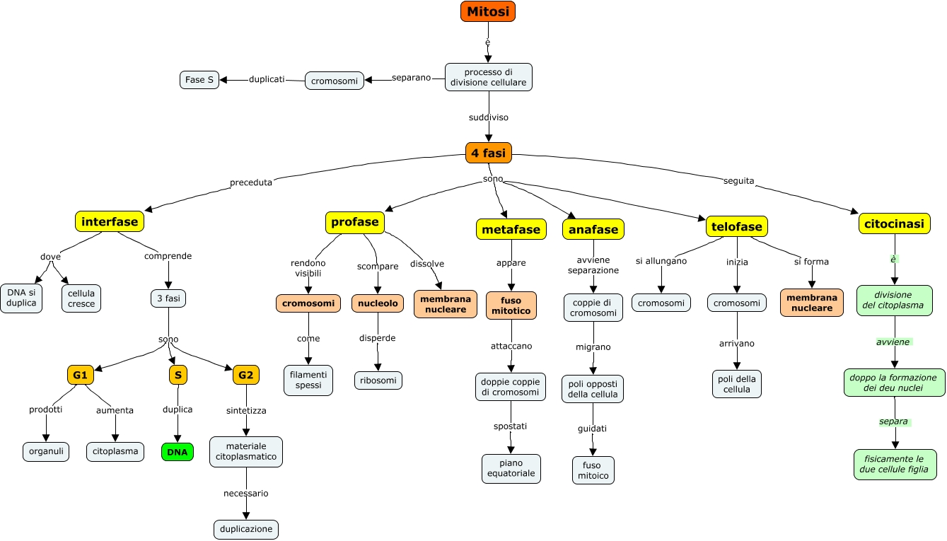 Questa Cmap, creata con IHMC CmapTools, contiene informazioni relative a: 12.4 Mitosi, doppo la formazione dei deu nuclei separa fisicamente le due cellule figlia, profase scompare nucleolo, processo di divisione cellulare suddiviso 4 fasi, metafase appare fuso mitotico, S duplica DNA, citocinasi è divisione del citoplasma, 4 fasi sono metafase, anafase avviene separazione coppie di cromosomi, interfase dove DNA si duplica, G1 prodotti organuli, telofase si allungano cromosomi, coppie di cromosomi migrano poli opposti della cellula, telofase inizia cromosomi, cromosomi arrivano poli della cellula, 3 fasi sono G1, processo di divisione cellulare separano cromosomi, Mitosi è processo di divisione cellulare, G2 sintetizza materiale citoplasmatico, cromosomi duplicati Fase S, 3 fasi sono S