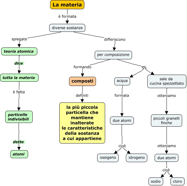 Questa Cmap, creata con IHMC CmapTools, contiene informazioni relative a: Cap. 2.5 Mappa Saperi essenziali DSA Teoria atomica della materia, particelle indivisibili dette atomi, per composizione es. acqua, composti definiti la più piccola particella che mantiene inalterate le caratteristiche della sostanza a cui appartiene, acqua formata due atomi, due atomi cioè ossigeno, due atomi cioè sodio, piccoli granelli finche otteniamo due atomi, per composizione formando composti, per composizione es. sale da cucina spezzettato, sale da cucina spezzettato otteniamo piccoli granelli finche, due atomi cioè cloro, teoria atomica dice tutta la materia, tutta la materia è fatta particelle indivisibili, diverse sostanze differiscono per composizione, diverse sostanze spiegate teoria atomica, La materia è formata diverse sostanze, due atomi cioè idrogeno