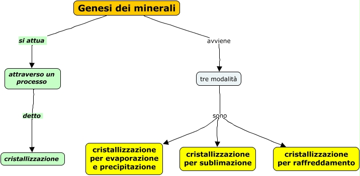 Questa Cmap, creata con IHMC CmapTools, contiene informazioni relative a: 10. 5 genesi dei minerali, tre modalità sono cristallizzazione per sublimazione, tre modalità sono cristallizzazione per evaporazione e precipitazione, Genesi dei minerali si attua attraverso un processo, attraverso un processo detto cristallizzazione, tre modalità sono cristallizzazione per raffreddamento, Genesi dei minerali avviene tre modalità