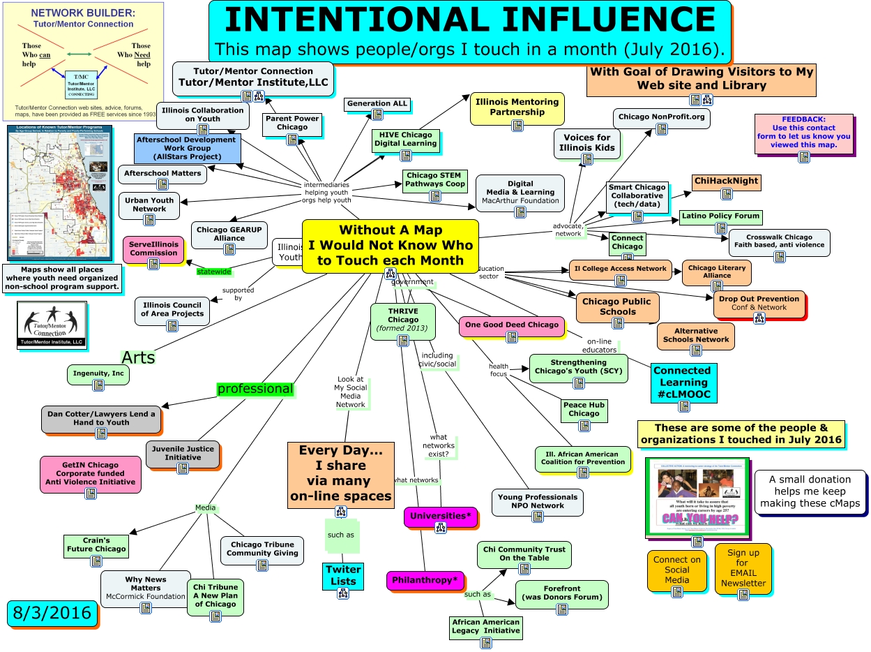 This Concept Map, created with IHMC CmapTools, has information related to: Influence the Network, Without A Map I Would Not Know Who to Touch each Month on-line educators Connected Learning #cLMOOC, Without A Map I Would Not Know Who to Touch each Month intermediaries helping youth orgs help youth Digital Media & Learning MacArthur Foundation, Without A Map I Would Not Know Who to Touch each Month advocate, network ChiHackNight, Without A Map I Would Not Know Who to Touch each Month professional Dan Cotter/Lawyers Lend a Hand to Youth, Without A Map I Would Not Know Who to Touch each Month advocate, network Crosswalk Chicago Faith based, anti violence, Without A Map I Would Not Know Who to Touch each Month intermediaries helping youth orgs help youth Generation ALL, Without A Map I Would Not Know Who to Touch each Month Look at My Social Media Network Every Day... I share via many on-line spaces, Without A Map I Would Not Know Who to Touch each Month government One Good Deed Chicago, Without A Map I Would Not Know Who to Touch each Month intermediaries helping youth orgs help youth Illinois Collaboration on Youth, Without A Map I Would Not Know Who to Touch each Month advocate, network Voices for Illinois Kids, Philanthropy* such as Forefront (was Donors Forum), Without A Map I Would Not Know Who to Touch each Month advocate, network Chicago NonProfit.org, Without A Map I Would Not Know Who to Touch each Month intermediaries helping youth orgs help youth Chicago GEARUP Alliance, Without A Map I Would Not Know Who to Touch each Month education sector Alternative Schools Network, Without A Map I Would Not Know Who to Touch each Month intermediaries helping youth orgs help youth Parent Power Chicago, Illinois Youth statewide ServeIllinois Commission, Without A Map I Would Not Know Who to Touch each Month Arts Ingenuity, Inc, Without A Map I Would Not Know Who to Touch each Month including civic/social Young Professionals NPO Network, Without A Map I Would Not Know Who to Touch each Month health focus Strengthening Chicago's Youth (SCY), Without A Map I Would Not Know Who to Touch each Month intermediaries helping youth orgs help youth Afterschool Development Work Group (AllStars Project)