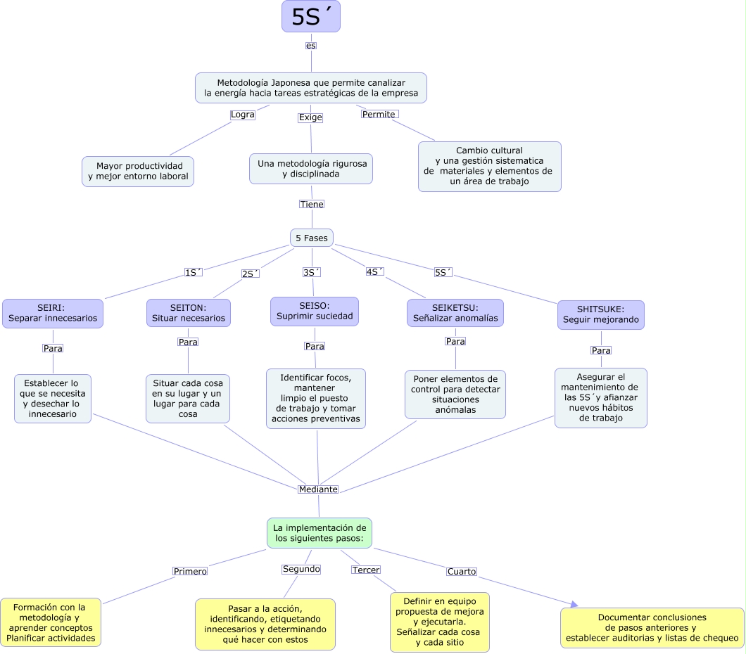 Este Cmap, tiene información relacionada con: Metodología 5S´, SEITON: Situar necesarios Para Situar cada cosa en su lugar y un lugar para cada cosa, Metodología Japonesa que permite canalizar la energía hacia tareas estratégicas de la empresa Logra Mayor productividad y mejor entorno laboral, 5 Fases 2S´ SEITON: Situar necesarios, SHITSUKE: Seguir mejorando Para Asegurar el mantenimiento de las 5S´y afianzar nuevos hábitos de trabajo, La implementación de los siguientes pasos: Segundo Pasar a la acción, identificando, etiquetando innecesarios y determinando qué hacer con estos, Situar cada cosa en su lugar y un lugar para cada cosa Mediante La implementación de los siguientes pasos:, Poner elementos de control para detectar situaciones anómalas Mediante La implementación de los siguientes pasos:, Metodología Japonesa que permite canalizar la energía hacia tareas estratégicas de la empresa Exige Una metodología rigurosa y disciplinada, SEIKETSU: Señalizar anomalías Para Poner elementos de control para detectar situaciones anómalas, SEISO: Suprimir suciedad Para Identificar focos, mantener limpio el puesto de trabajo y tomar acciones preventivas, 5S´ es Metodología Japonesa que permite canalizar la energía hacia tareas estratégicas de la empresa, Una metodología rigurosa y disciplinada Tiene 5 Fases, 5 Fases 5S´ SHITSUKE: Seguir mejorando, La implementación de los siguientes pasos: Cuarto Documentar conclusiones de pasos anteriores y establecer auditorias y listas de chequeo, 5 Fases 4S´ SEIKETSU: Señalizar anomalías, La implementación de los siguientes pasos: Tercer Definir en equipo propuesta de mejora y ejecutarla. Señalizar cada cosa y cada sitio, Metodología Japonesa que permite canalizar la energía hacia tareas estratégicas de la empresa Permite Cambio cultural y una gestión sistematica de materiales y elementos de un área de trabajo, 5 Fases 3S´ SEISO: Suprimir suciedad, SEIRI: Separar innecesarios Para Establecer lo que se necesita y desechar lo innecesario, 5 Fases 1S´ SEIRI: Separar innecesarios