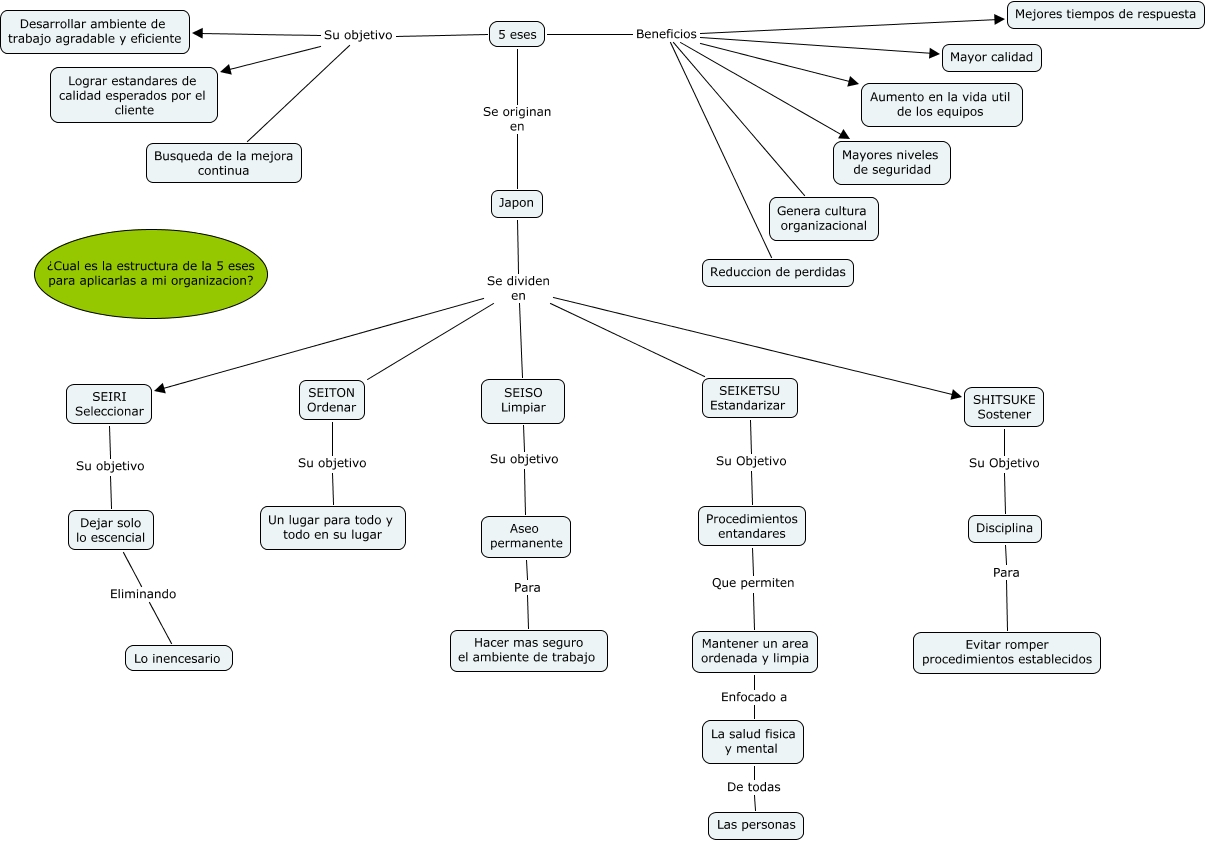 Este Cmap, tiene información relacionada con: Sin Título 2, 5 eses Se originan en Japon, 5 eses Beneficios Aumento en la vida util de los equipos, 5 eses Beneficios Mejores tiempos de respuesta, La salud fisica y mental De todas Las personas, 5 eses Beneficios Mayor calidad, Dejar solo lo escencial Eliminando Lo inencesario, Procedimientos entandares Que permiten Mantener un area ordenada y limpia, 5 eses Beneficios Mayores niveles de seguridad, SHITSUKE Sostener Su Objetivo Disciplina, Japon Se dividen en SEISO Limpiar, SEISO Limpiar Su objetivo Aseo permanente, Japon Se dividen en SEITON Ordenar, 5 eses Su objetivo Busqueda de la mejora continua, SEIKETSU Estandarizar Su Objetivo Procedimientos entandares, Mantener un area ordenada y limpia Enfocado a La salud fisica y mental, SEITON Ordenar Su objetivo Un lugar para todo y todo en su lugar, SEIRI Seleccionar Su objetivo Dejar solo lo escencial, Japon Se dividen en SHITSUKE Sostener, 5 eses Su objetivo Lograr estandares de calidad esperados por el cliente, 5 eses Beneficios Reduccion de perdidas