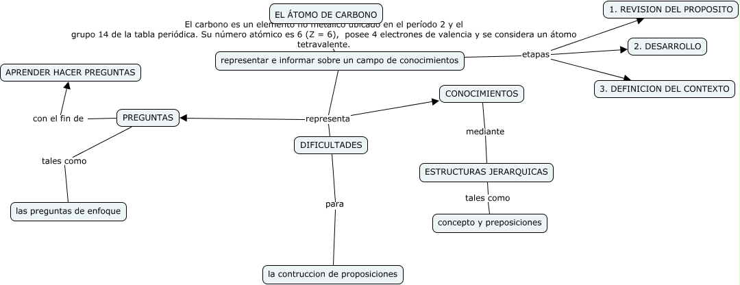 Este Cmap, tiene información relacionada con: MAPAS CONCEPTUALES, PREGUNTAS con el fin de APRENDER HACER PREGUNTAS, representar e informar sobre un campo de conocimientos etapas 2. DESARROLLO, ESTRUCTURAS JERARQUICAS tales como concepto y preposiciones, EL ÁTOMO DE CARBONO El carbono es un elemento no metálico ubicado en el período 2 y el grupo 14 de la tabla periódica. Su número atómico es 6 (Z = 6), posee 4 electrones de valencia y se considera un átomo tetravalente. representar e informar sobre un campo de conocimientos, CONOCIMIENTOS mediante ESTRUCTURAS JERARQUICAS, DIFICULTADES para la contruccion de proposiciones, representar e informar sobre un campo de conocimientos representa DIFICULTADES, representar e informar sobre un campo de conocimientos etapas 1. REVISION DEL PROPOSITO, representar e informar sobre un campo de conocimientos etapas 3. DEFINICION DEL CONTEXTO, PREGUNTAS tales como las preguntas de enfoque, representar e informar sobre un campo de conocimientos representa CONOCIMIENTOS, representar e informar sobre un campo de conocimientos representa PREGUNTAS