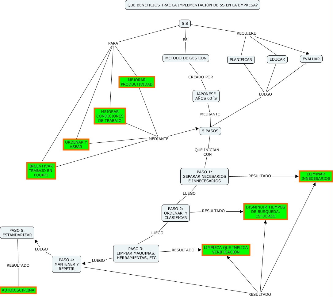 This Concept Map, created with IHMC CmapTools, has information related to: IMPLEMENTAR 5 S[1].cmap, EDUCAR LUEGO 5 PASOS, PASO 2: ORDENAR Y CLASIFICAR RESULTADO DISMINUIR TIEMPOS DE BUSQUEDA, ESFUERZO, PASO 3: LIMPIAR MAQUINAS, HERRAMIENTAS, ETC RESULTADO LIMPIEZA QUE IMPLICA VERIFICACIÓN, ORDENAR Y ASEAR MEDIANTE 5 PASOS, EVALUAR LUEGO 5 PASOS, 5 S REQUIERE EVALUAR, 5 S REQUIERE EDUCAR, MEJORAR PRODUCTIVIDAD MEDIANTE 5 PASOS, INCENTIVAR TRABAJO EN EQUIPO MEDIANTE 5 PASOS, PASO 5: ESTANDARIZAR RESULTADO AUTODISCIPLINA, MEJORAR CONDICIONES DE TRABAJO MEDIANTE 5 PASOS, PASO 3: LIMPIAR MAQUINAS, HERRAMIENTAS, ETC LUEGO PASO 4: MANTENER Y REPETIR, 5 S REQUIERE PLANIFICAR, PASO 4: MANTENER Y REPETIR RESULTADO ELIMINAR INNECESARIOS, PASO 4: MANTENER Y REPETIR LUEGO PASO 5: ESTANDARIZAR, PLANIFICAR LUEGO 5 PASOS, 5 S ES METODO DE GESTION, 5 S PARA MEJORAR CONDICIONES DE TRABAJO, PASO 2: ORDENAR Y CLASIFICAR LUEGO PASO 3: LIMPIAR MAQUINAS, HERRAMIENTAS, ETC, PASO 1: SEPARAR NECESARIOS E INNECESARIOS RESULTADO ELIMINAR INNECESARIOS