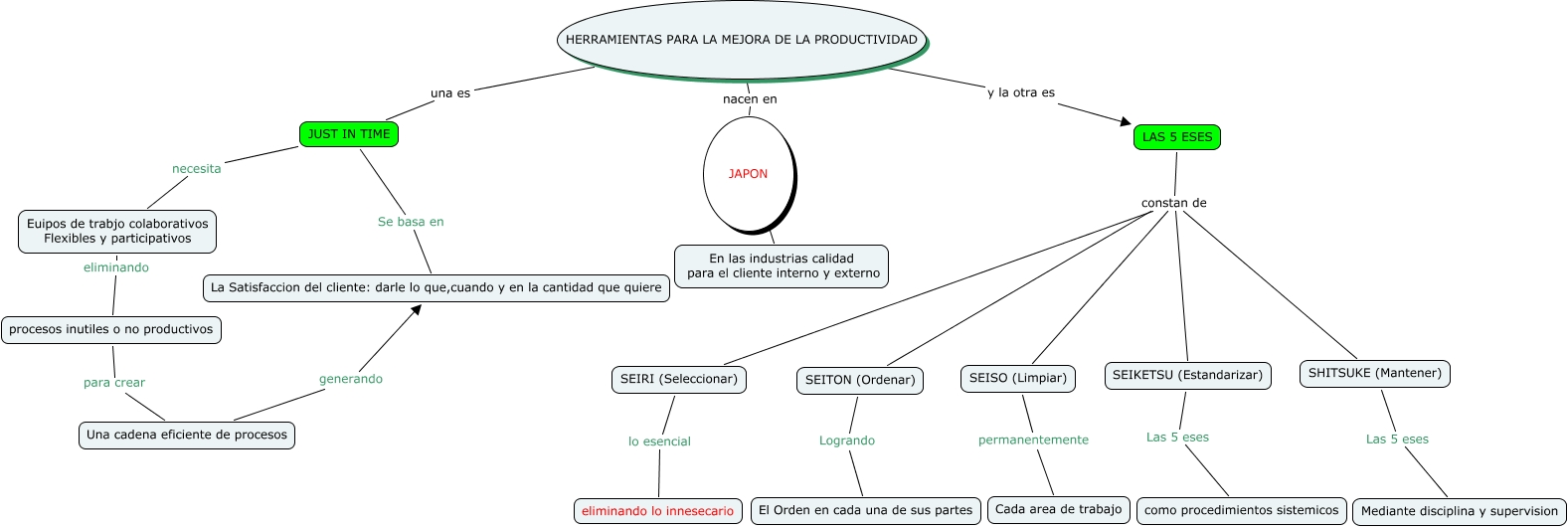 Este Cmap, tiene información relacionada con: HERRAMIENTAS PAR LA MEJORA DE LA PRODUCTIVIDAD, SEIRI (Seleccionar) lo esencial eliminando lo innesecario, SEITON (Ordenar) constan de SEISO (Limpiar), LAS 5 ESES constan de SEIRI (Seleccionar), JAPON creando En las industrias calidad para el cliente interno y externo, SEITON (Ordenar) constan de SEIRI (Seleccionar), LAS 5 ESES constan de SHITSUKE (Mantener), LAS 5 ESES constan de SEIKETSU (Estandarizar), procesos inutiles o no productivos para crear Una cadena eficiente de procesos, Euipos de trabjo colaborativos Flexibles y participativos eliminando procesos inutiles o no productivos, LAS 5 ESES constan de SEISO (Limpiar), HERRAMIENTAS PARA LA MEJORA DE LA PRODUCTIVIDAD una es JUST IN TIME, HERRAMIENTAS PARA LA MEJORA DE LA PRODUCTIVIDAD nacen en JAPON, SEITON (Ordenar) constan de SHITSUKE (Mantener), SHITSUKE (Mantener) Las 5 eses Mediante disciplina y supervision, HERRAMIENTAS PARA LA MEJORA DE LA PRODUCTIVIDAD y la otra es LAS 5 ESES, Una cadena eficiente de procesos generando La Satisfaccion del cliente: darle lo que,cuando y en la cantidad que quiere, JUST IN TIME Se basa en La Satisfaccion del cliente: darle lo que,cuando y en la cantidad que quiere, SEISO (Limpiar) permanentemente Cada area de trabajo, JUST IN TIME necesita Euipos de trabjo colaborativos Flexibles y participativos, SEIKETSU (Estandarizar) Las 5 eses como procedimientos sistemicos