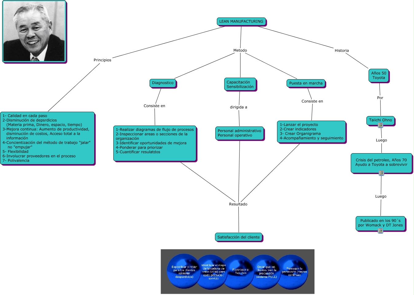 This Concept Map, created with IHMC CmapTools, has information related to: Trabajo Final Catalina Betancur-Camilo Agudelo[1].cmap, LEAN MANUFACTURING Principios 1- Calidad en cada paso 2-Disminución de depsrdicios (Materia prima, Dinero, espacio, tiempo) 3-Mejora continua: Aumento de productividad, disminución de costos, Acceso total a la información 4-Concientización del método de trabajo "jalar" no "empujar" 5- Flexibilidad 6-Involucrar proveedores en el proceso 7- Polivalencia, Capacitación Sensibilización dirigida a Personal administrativo Personal operativo, Años 50 Toyota Por Taiichi Ohno, 1-Realizar diagramas de flujo de procesos 2-Inspeccionar areas o secciones de la organización 3-Identificar oportunidades de mejora 4-Ponderar para priorizar 5-Cuantificar resulatdos Resultado Satisfacción del cliente, Diagnostico Consiste en 1-Realizar diagramas de flujo de procesos 2-Inspeccionar areas o secciones de la organización 3-Identificar oportunidades de mejora 4-Ponderar para priorizar 5-Cuantificar resulatdos, LEAN MANUFACTURING Metodo Puesta en marcha, Puesta en marcha Consiste en 1-Lanzar el proyecto 2-Crear indicadores 3- Crear Organigrama 4-Acompañamiento y seguimiento, Crisis del petroleo, Años 70 Ayudo a Toyota a sobrevivir Luego Publicado en los 90´s por Womack y DT Jones, Taiichi Ohno Luego Crisis del petroleo, Años 70 Ayudo a Toyota a sobrevivir, LEAN MANUFACTURING Metodo Diagnostico, LEAN MANUFACTURING Metodo Capacitación Sensibilización, LEAN MANUFACTURING Historia Años 50 Toyota, Personal administrativo Personal operativo Resultado Satisfacción del cliente, 1-Lanzar el proyecto 2-Crear indicadores 3- Crear Organigrama 4-Acompañamiento y seguimiento Resultado Satisfacción del cliente