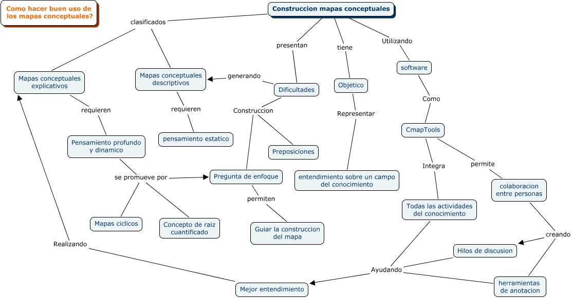 Este Cmap, tiene información relacionada con: Fundamentos mapas conceptuales, Pensamiento profundo y dinamico se promueve por Concepto de raiz cuantificado, Dificultades Construccion Pregunta de enfoque, Mapas conceptuales descriptivos requieren pensamiento estatico, colaboracion entre personas creando Hilos de discusion, Construccion mapas conceptuales clasificados Mapas conceptuales explicativos, Construccion mapas conceptuales presentan Dificultades, Dificultades Construccion Preposiciones, Construccion mapas conceptuales Utilizando software, Todas las actividades del conocimiento Ayudando Mejor entendimiento, Pensamiento profundo y dinamico se promueve por Mapas ciclicos, Construccion mapas conceptuales tiene Objetico, Mejor entendimiento Realizando Mapas conceptuales explicativos, software Como CmapTools, colaboracion entre personas creando herramientas de anotacion, Mapas conceptuales explicativos requieren Pensamiento profundo y dinamico, Construccion mapas conceptuales clasificados Mapas conceptuales descriptivos, Pensamiento profundo y dinamico se promueve por Pregunta de enfoque, Objetico Representar entendimiento sobre un campo del conocimiento, Dificultades generando Mapas conceptuales descriptivos, CmapTools Integra Todas las actividades del conocimiento