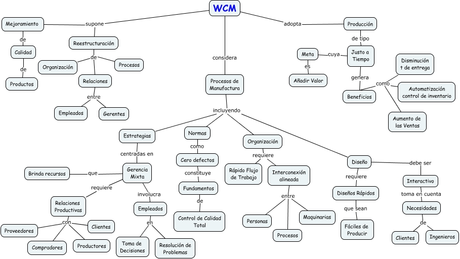 Este Cmap, tiene información relacionada con: WCM, Compradores con Relaciones Productivas, Relaciones de Reestructuración, Normas incluyendo Procesos de Manufactura, Ingenieros de Necesidades, Diseño incluyendo Procesos de Manufactura, Procesos de Reestructuración, Rápido Flujo de Trabajo requiere Organización, Relaciones Productivas requiere Gerencia Mixta, Necesidades toma en cuenta Interactivo, Meta cuya Justo a Tiempo, Resolución de Problemas en Empleados, Diseños Rápidos requiere Diseño, Interactivo debe ser Diseño, Disminución t de entrega como Beneficios, Gerentes entre Relaciones, Organización incluyendo Procesos de Manufactura, Interconexión alineada requiere Organización, Empleados entre Relaciones, Aumento de las Ventas como Beneficios, WCM supone Mejoramiento