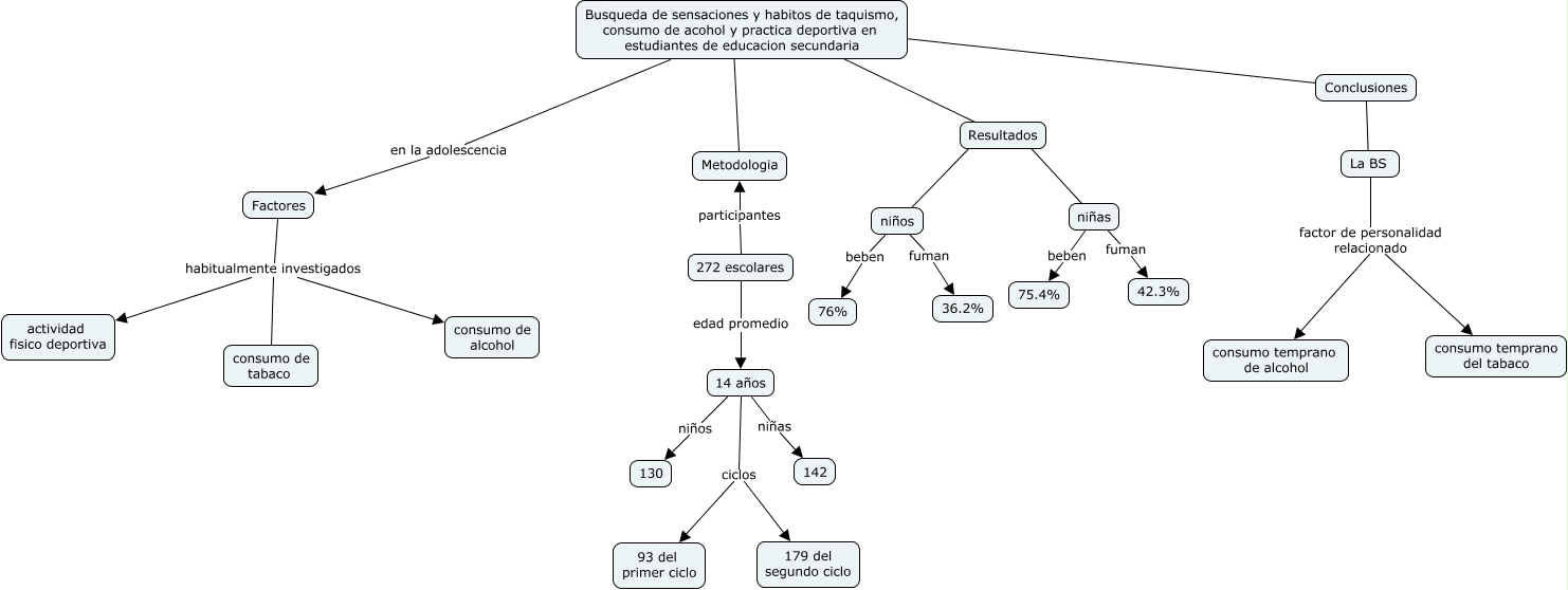 Este Cmap, tiene información relacionada con: mapas conceptuales, niños ???? Resultados, Resultados ???? Busqueda de sensaciones y habitos de taquismo, consumo de acohol y practica deportiva en estudiantes de educacion secundaria, La BS factor de personalidad relacionado consumo temprano del tabaco, Busqueda de sensaciones y habitos de taquismo, consumo de acohol y practica deportiva en estudiantes de educacion secundaria en la adolescencia Factores, 14 años ciclos 93 del primer ciclo, 14 años ciclos 179 del segundo ciclo, Factores habitualmente investigados actividad fisico deportiva, Conclusiones BS La BS, Metodologia ???? Busqueda de sensaciones y habitos de taquismo, consumo de acohol y practica deportiva en estudiantes de educacion secundaria, 272 escolares edad promedio 14 años, Conclusiones ???? Busqueda de sensaciones y habitos de taquismo, consumo de acohol y practica deportiva en estudiantes de educacion secundaria, niñas fuman 42.3%, La BS factor de personalidad relacionado consumo temprano de alcohol, niñas beben 75.4%, 14 años niños 130, niños beben 76%, 14 años niñas 142, niños fuman 36.2%, niños ???? Resultados, Factores habitualmente investigados consumo de alcohol